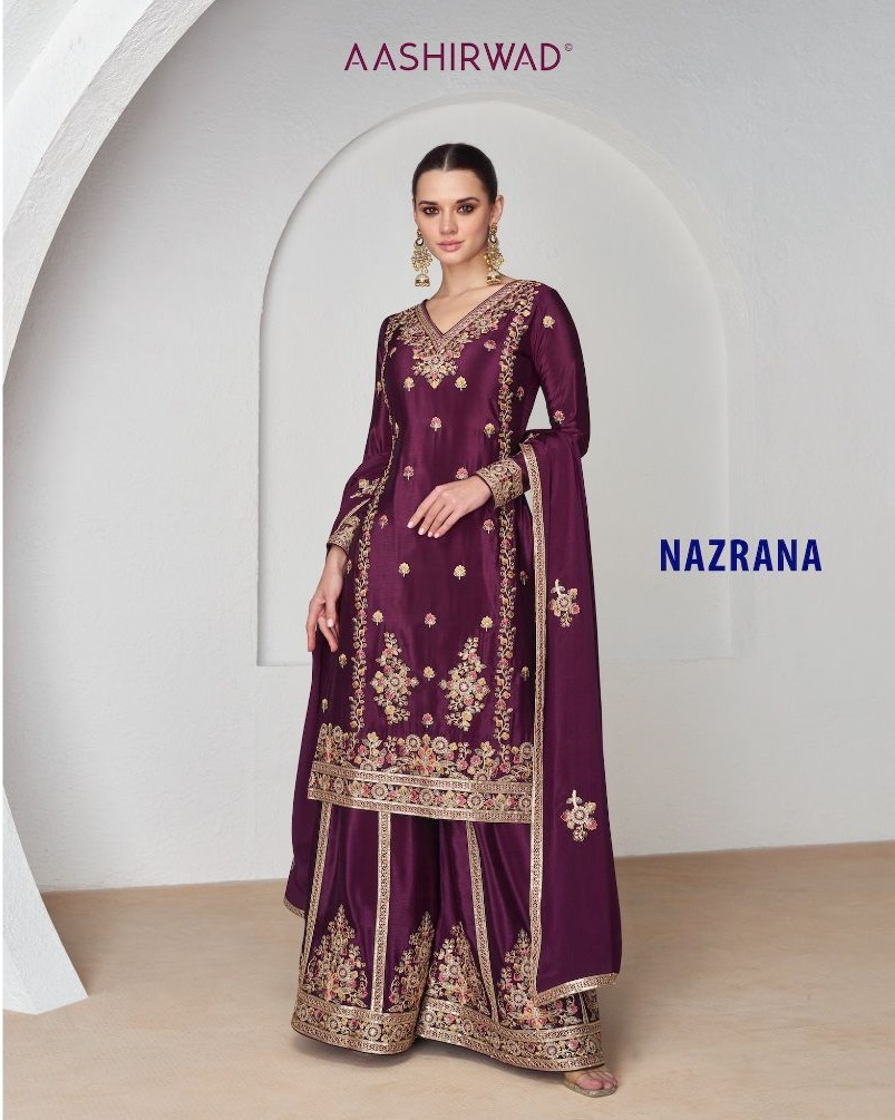 AASHIRWAD NAZRANA DESIGNER CHINNON SILK SUIT WHOLESALER IN SURAT