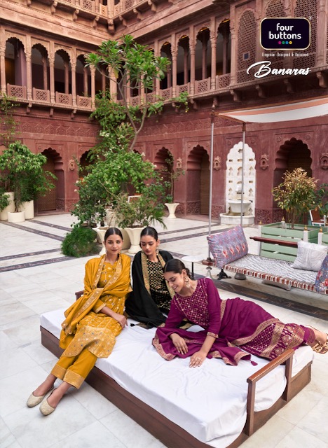 FOUR BUTTONS BANARAS KURTI PANT WITH DUPATTA AT SURAT