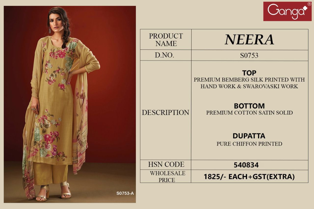 GANGA BEMBERG NEERA S0753 SILK PRINTED SALWAR SUITS SUPPLIER SURAT