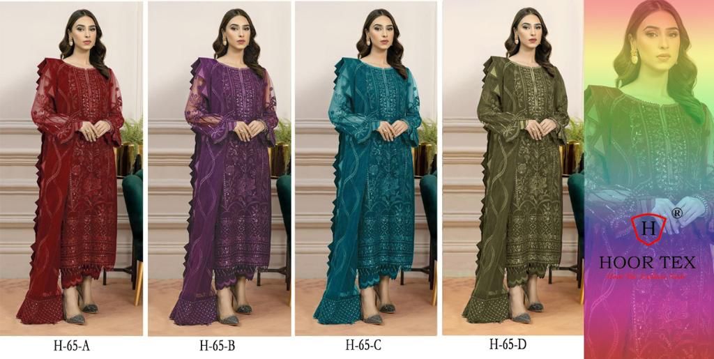 HOOR TEX H 65 FOUX GEORGETTE EMBROIDERY PAKISTANI SUITS WHOLESALE
