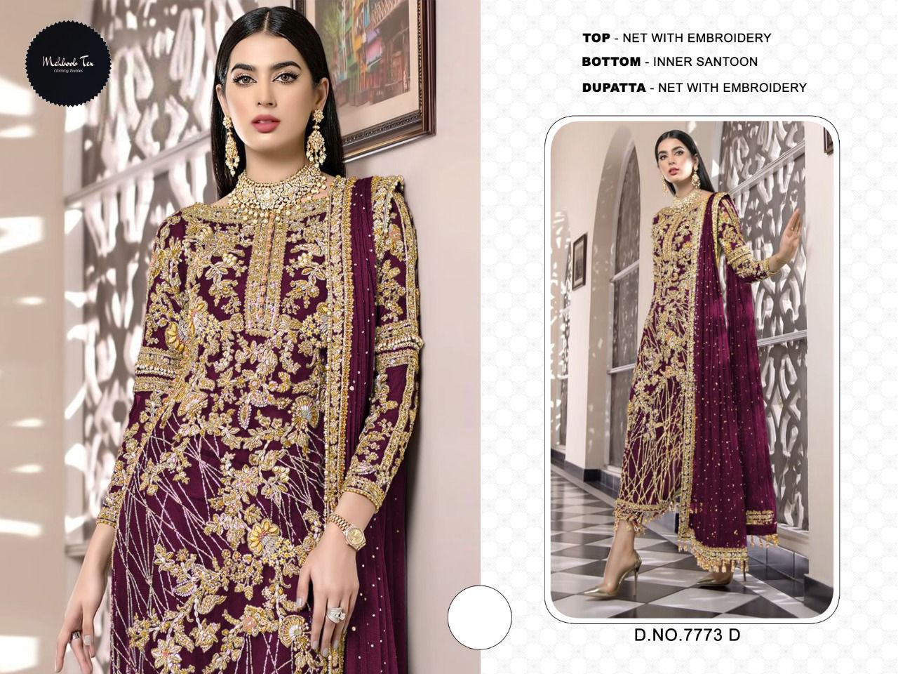 MEHBOOB CRIMSON D.NO 7773 PAKISTANI SUITS AT WHOLESALE