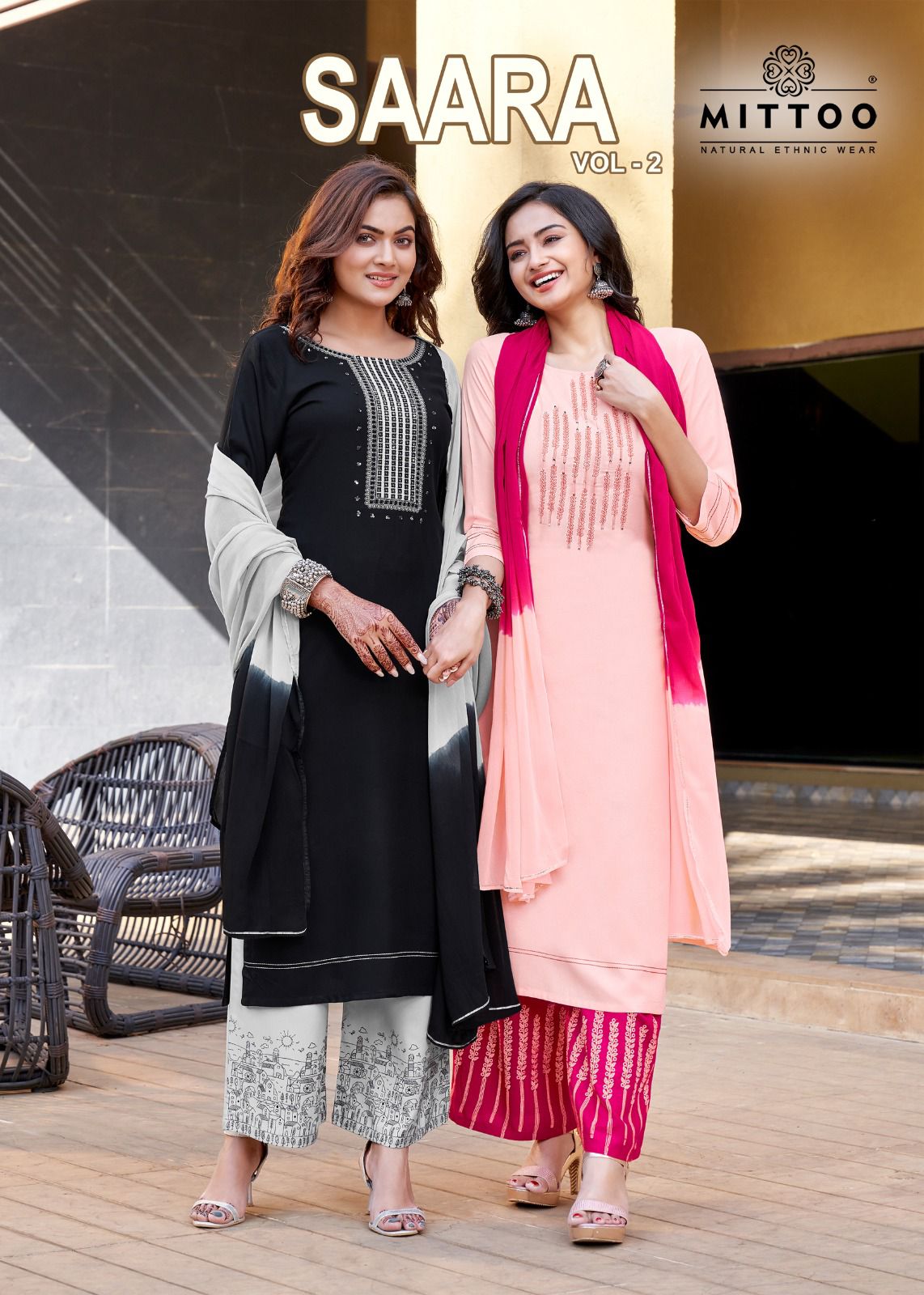 MITTOO SAARA VOL 2 RAYON KURTI PANT WITH DUPATTA LATEST CATALOGUE