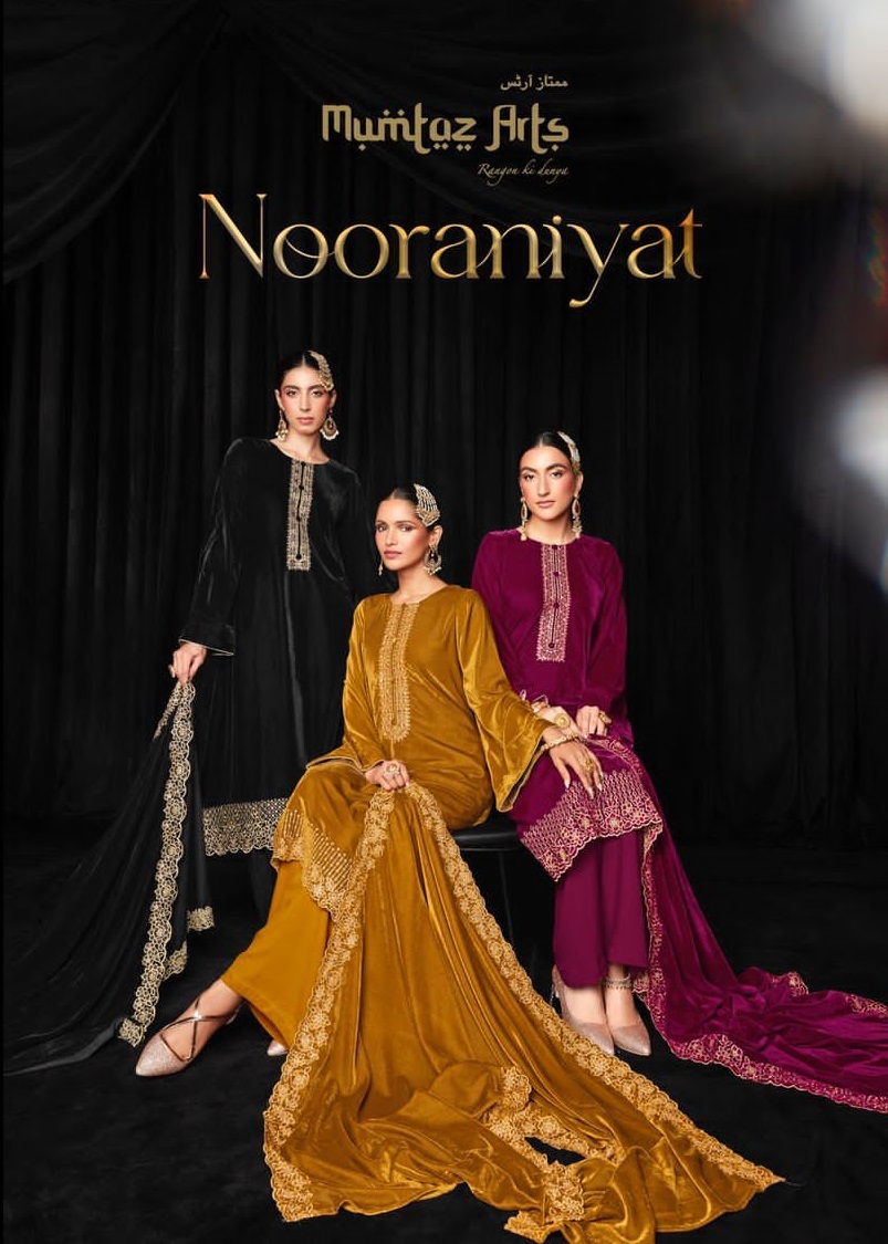 MUMTAZ ARTS NOORANIYAT WINTER SPLECIAL VILVET EMBROIDERY SUITS AT SURAT