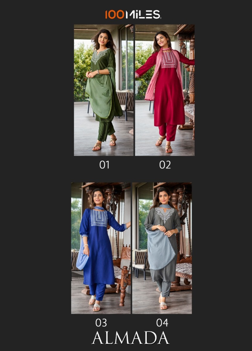 | DETAILS | *Catalog : *ALMADA* BRAND : 100MILES®️Style : Kurti + Pant + Dupatta *3 Psc Readymade set*TYPE : Fancy blended fabric heavy embroidery 3 psc readymade set.SIZES : M to 2XL RATE : *880/-*(Kurti with pants and dupatta) Pieces: 4 per Bag |