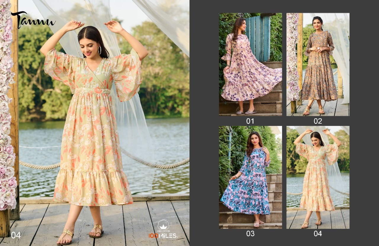 | DETAILS | *Style : Premium georgette *long dress* with *pure cotton inner* and with detailing and flair gathers.Length: *49”-50”*BRAND : 100MILES®️SIZES : M to 2XLPieces: 4 per Bag |