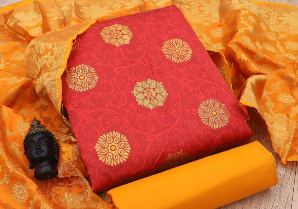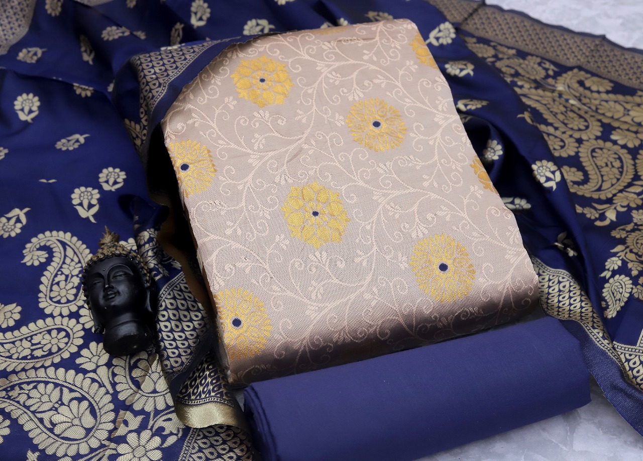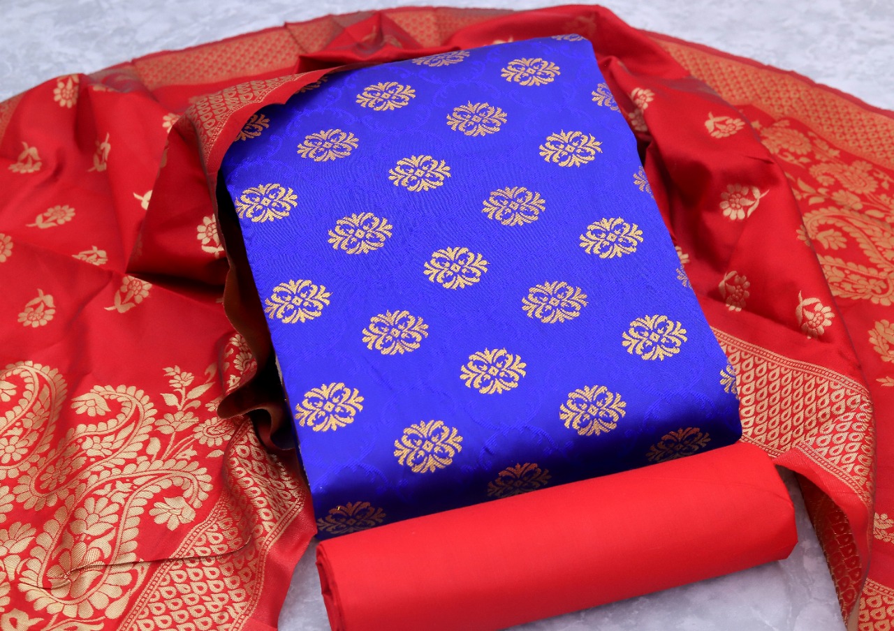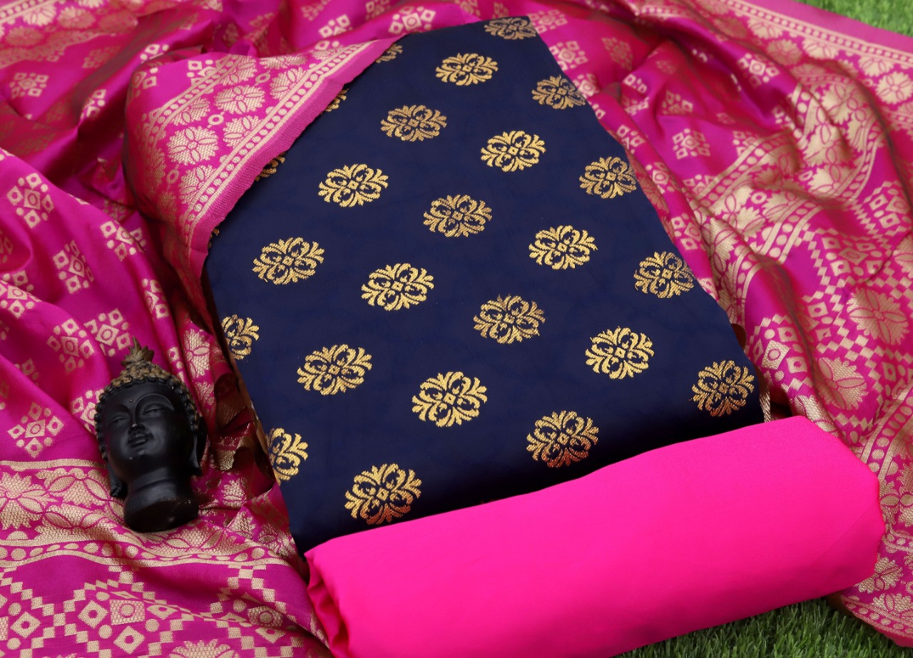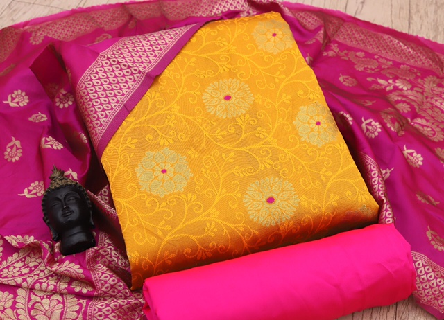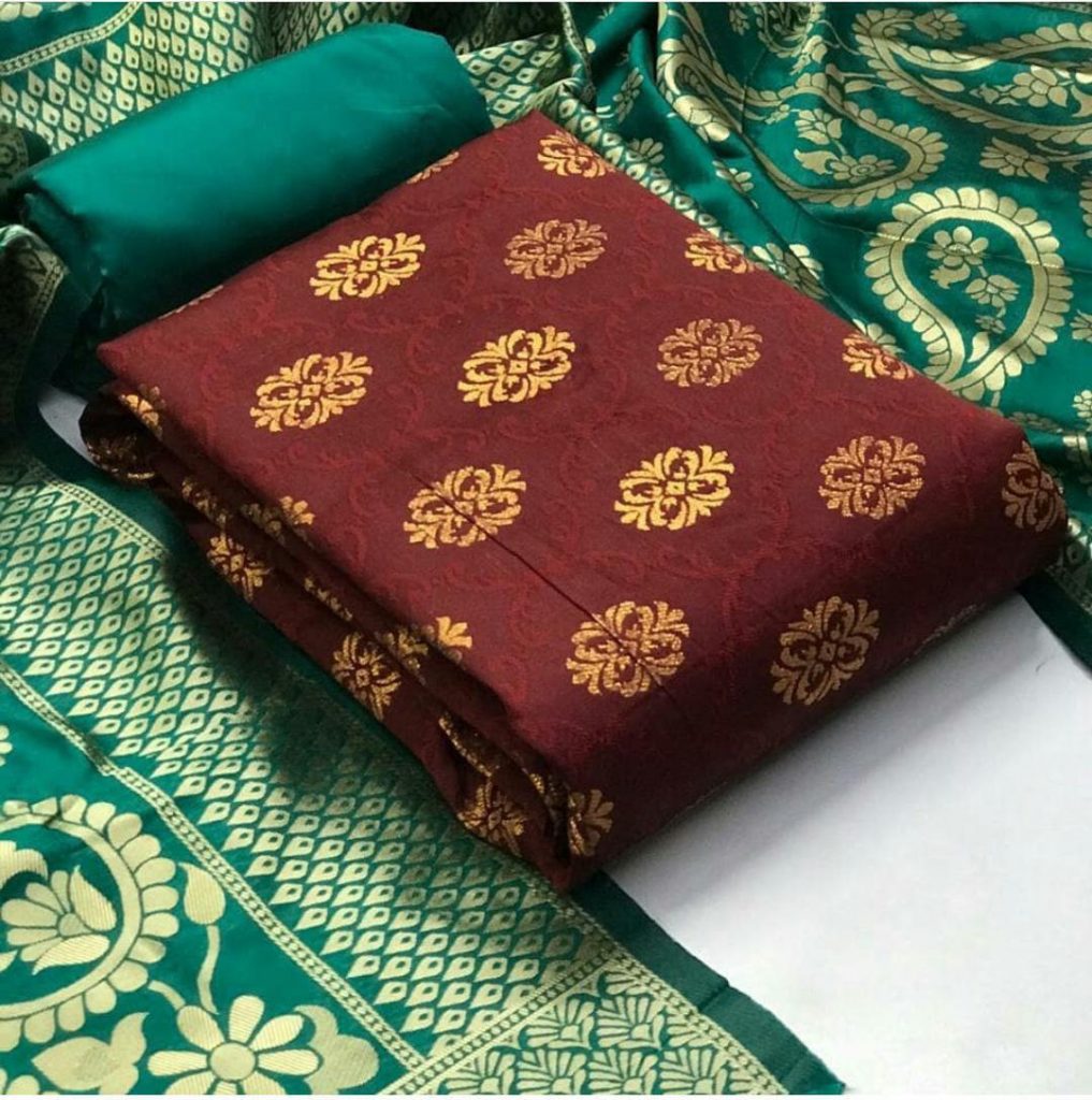| DETAILS | *FABRIC DETAIL* ?*TOP : BANARASI SILK (2.50 MTR)* ?*BOTTOM : TAPETA SILKS 2.50 CUT ?*DUPATTA : JECQUARD WEAVING (2.20 MTR)* ?????? *UPTO XXXXL YOU CAN STITCH THE SUITS.* ⏭️ *RATE: 399/-* |