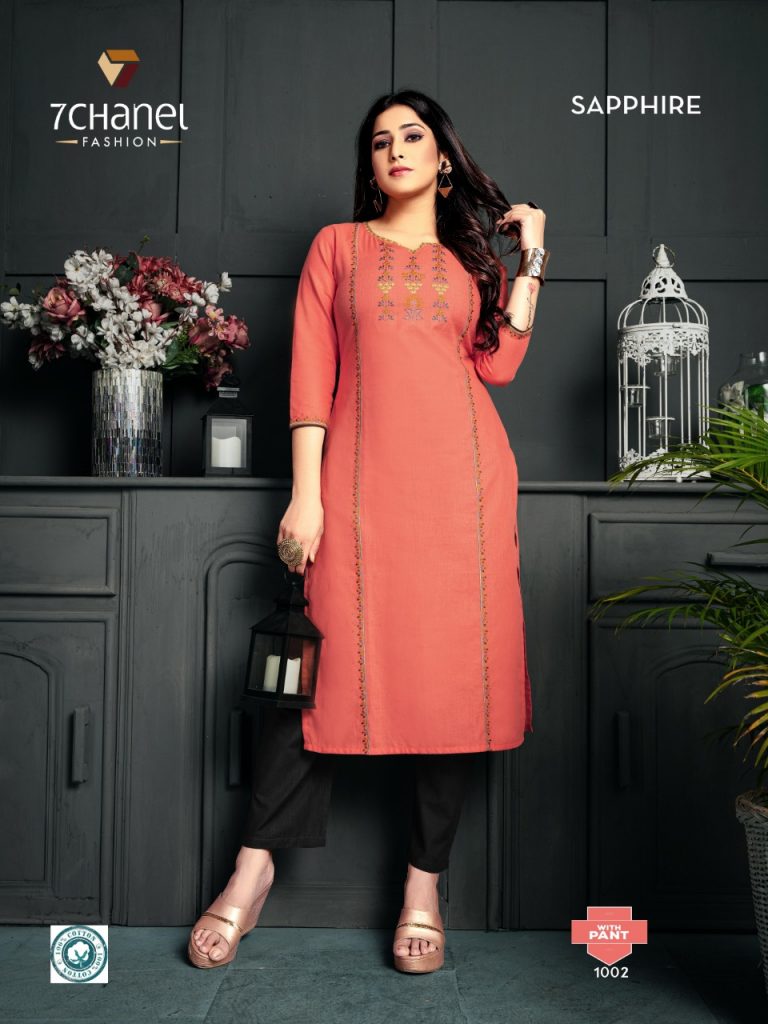 | DETAILS | ??? Presenting you with our finest Kurti set collection for the upcoming festive season! Get ready to flaunt your festive styles in *7 Chanel* attire to make all those heads turn. We wish you all smiles and blushes. ?? *”SAPPHIRE”* *FABRIC* – *RATE – RS.695/-* SIZES – M, L, XL & 2XL. LENGTH ??? |
