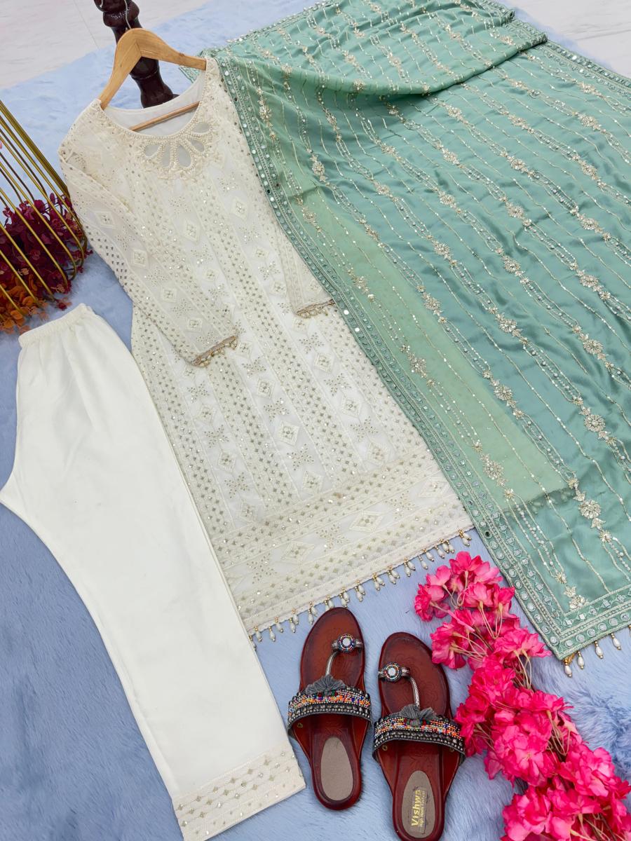 | FABRIC DETAILS | Top Fabric :Heavy Faux Georgette With Embroidery 3 mm Sequence Work With Rivet Moti Work With Full Sleeve With Fancy Latkan Top Inner :Micro Cotton Top Length:43-44 Inch Top Size : up to 42 XL Free Size & XXL 44 Margin (Full Stitched)Bottom Fabric :Heavy Micro Cotton With Embroidery Sequence Work With Elastic Bottom Length 39 Inch (Full Stitched)Dupatta Fabric:Heavy Faux Georgette With Embroidery 3 mm Sequence Work With Four Side Real Mirror Hand Work With Rivet Moti Work With Fancy Latkan Dupatta Length: 2.20 Mtr |