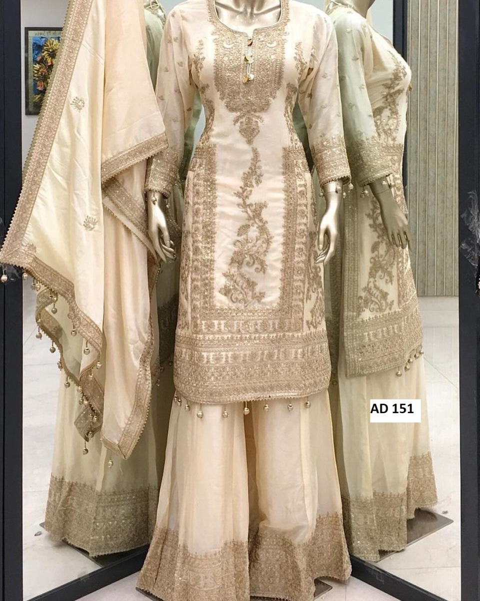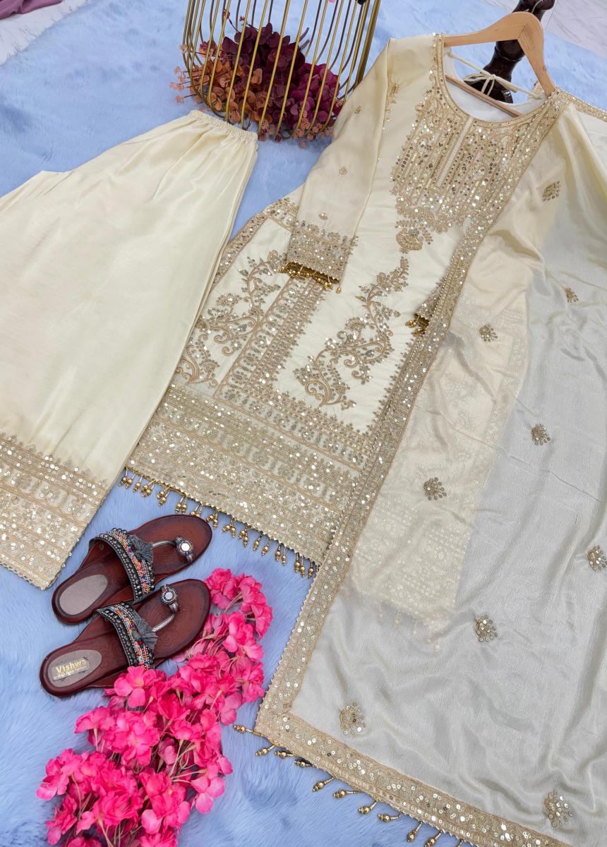 | FABRIC DETAILS | Top Fabric :Pur Chinon Silk With Embroidery 5 mm Sequence & Coding Dori Work With Full Sleeves With Fancy Latkan & Tassels Top Inner :Micro Cotton Top Length:43-44 Inch Top Size : up to 42 XL Free SIze & XXl 44 Margin (Full Stitched )Plazzo Fabric:Pur Chinon Silk With Embroidery 5 mm Sequence & Coding Dori Work Plazzo Inner:Micro Cotton Plazzo Length:40-41 Inc (Fully Stitched)Dupatta Fabric:Pur Chinon Silk With Embroidery 5 mm Sequence & Coding Dori Work With Fancy Latkan Dupatta Length: 2.20 MtrWEIGHT :900 gm |
