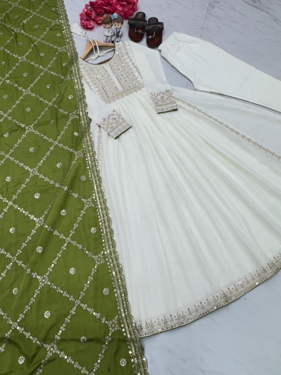 | FABRIC DETAILS | Anarkali Gown Fabric :Pur Chinon Silk With Embroidery 5 mm Sequence Work With Sleeve With Tassels Gown Inner : Micro Cotton Gown Size : Up To 42 Xl Free Size & XXl 44 Margin (Fully Stiched) Gown Length :51-52 Inches Gown Flair : 3 MeterBottom Fabric:Heavy Micro Cotton Bottom Length 39 Inch (Full Stitched)Dupatta Fabric :Pur Chinon Silk With Embroidery 5 mm Sequence Work With CutWork Dupatta Length:2.20 Meter |