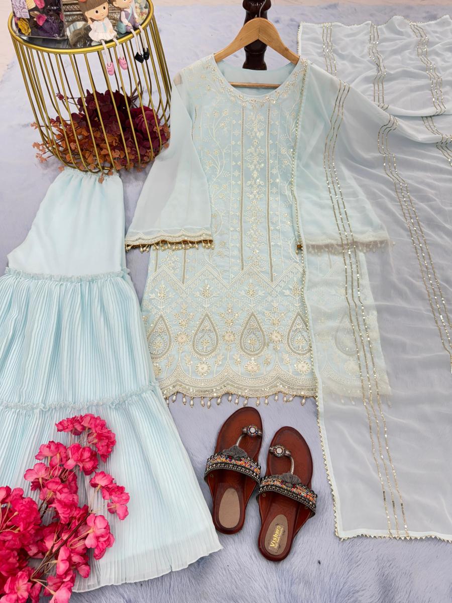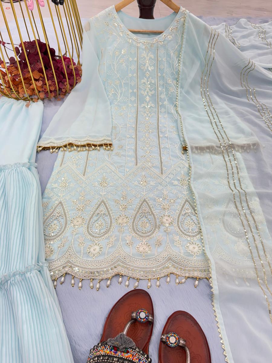 | FABRIC DETAILS | Top Fabric :Heavy Faux Georgette With Heavy Embroidery 3 mm Sequence Work With Fancy Bell Sleeves With Fancy Latkan Top Inner :Micro Cotton Top Length:37-38 Inch Top Size : up to 42 XL Free SIze & XXl 44 Margin (Full Stitched )Sarara Plazzo Fabric: Heavy Crushed Faux Georgette Plazzo Inner:Micro Cotton Plazzo Length:40-41 Inc (Fully Stitched)Dupatta Fabric:Heavy Faux Georgette With Embroidery 3 mm Sequence Work With Four Side Lece Broder Dupatta Length: 2.20 Mtr |