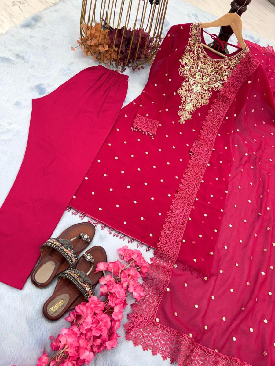 | FABRIC DETAILS | Top Fabric :Heavy Faux Georgette With Embroidery 5 mm Sequence Work With Pal Moti Hand Work With Full Sleeve With Fancy Latkan Top Inner :Micro Cotton Top Length:44-45 Inch Top Size : up to 42 XL Free Size & XXL 44 Margin (Full Stitched)Bottom Fabric :Heavy Micro Cotton With Elastic Bottom Length 39 Inch (Full Stitched)Dupatta Fabric:Heavy Faux Georgette With Embroidery 5 mm Sequence Work With Four Side Fancy Gpu Leach Border Dupatta Length: 2.20 Mtr |