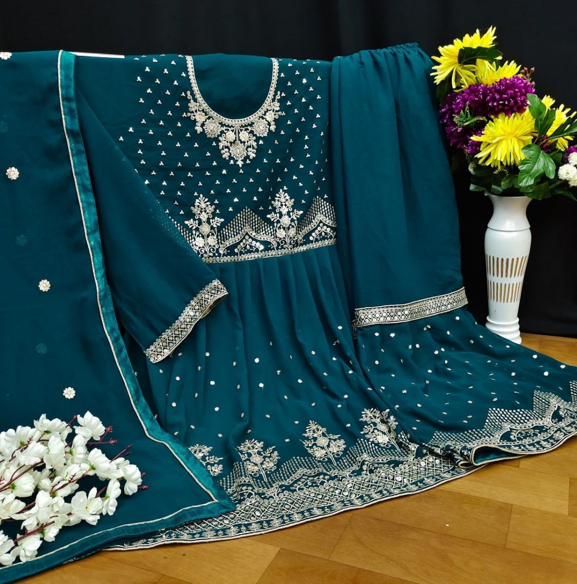 | DETAILS | *Fabrics Details :-**TOP : -* :- Blooming Georgette With Embroidery + Siqunce Work*INNER :-* Santoon *Length :-* Max Up to 40”+ *Size :-* Max Up to 48”+*BOTTOM* :- Blooming Georgette With Siqunce Work*LENTH:-*. 44’’ Inch *INNER:-* Santoon *SIZE:-* Fully Stitch 44+ Inch*DUPATTA* :- Blooming Georgette + Embroidery Work + Siqunce Work*Type :-* Semi Stitched ( Bottom Fully Stitch) *Weight :-* 1.200kg *Wash :-* First Time Dry Clean |
