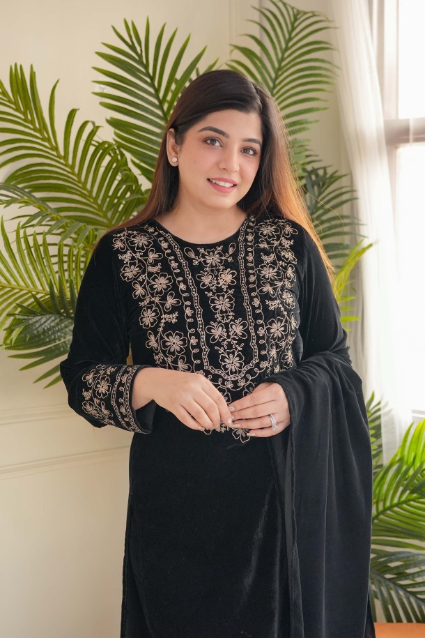 | FABRIC DETAILS | SHANYA PURE HIGH QUALITY VELVET SUIT SET[Kurti pent DUPPTA Full 3 piece set]Presenting VELVET SUIT SET WITH FINE EMBROIDERY ON THE NECK COMING ALONG WITH STRAIGHT VELVET KURTA PANTS DUPPTA SIZE - M L XL XXLColour - BLACK |