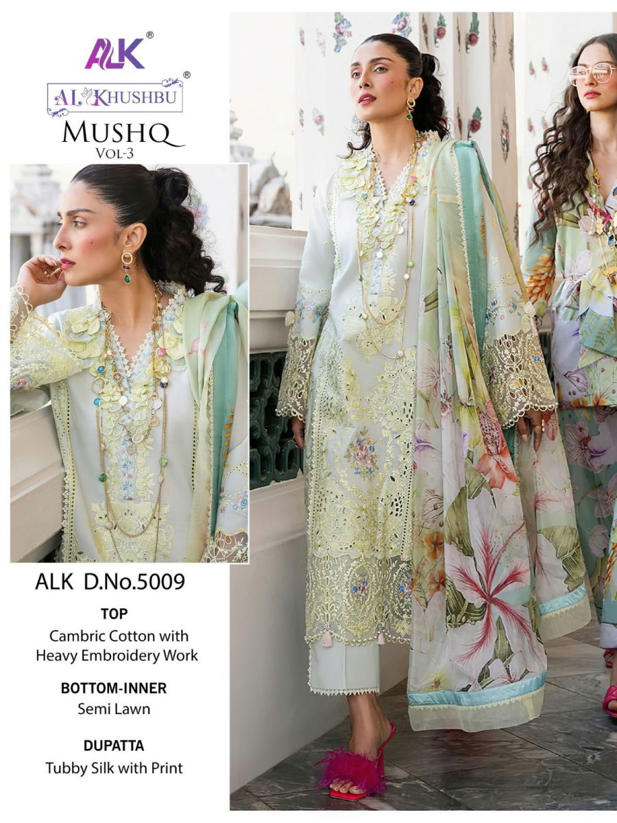 FABRIC DETAILS :- Top : PURE CAMBRIC COTTON WITH HEAVY EMBROIDERY WITH MOTHIBottom :PURE PC COTTONDupatta : TUBBY SILK PRINTE AL KHUSHBU ALK 5005 TO 5009 MUSHQ VOL 3 SALWAR SUITS