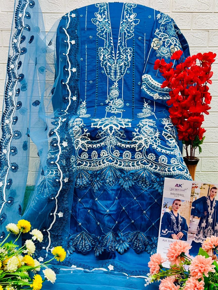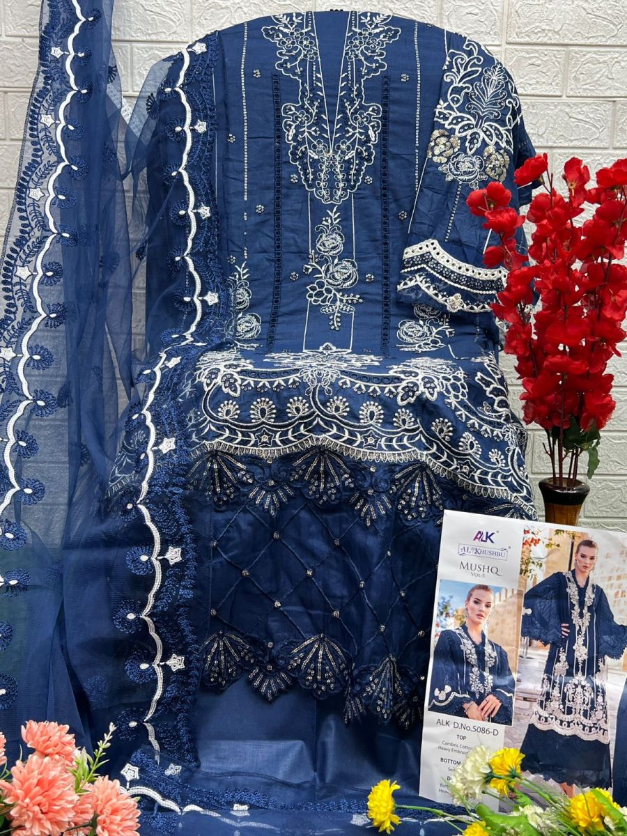 | FABRIC DETAILS | Top : PURE CAMBRIC COTTON WITH HEAVY EMBROIDERYBottom :PURE PC COTTONDupatta : BUTTERFLY NET WITH HEVEY EMBROIDERY |