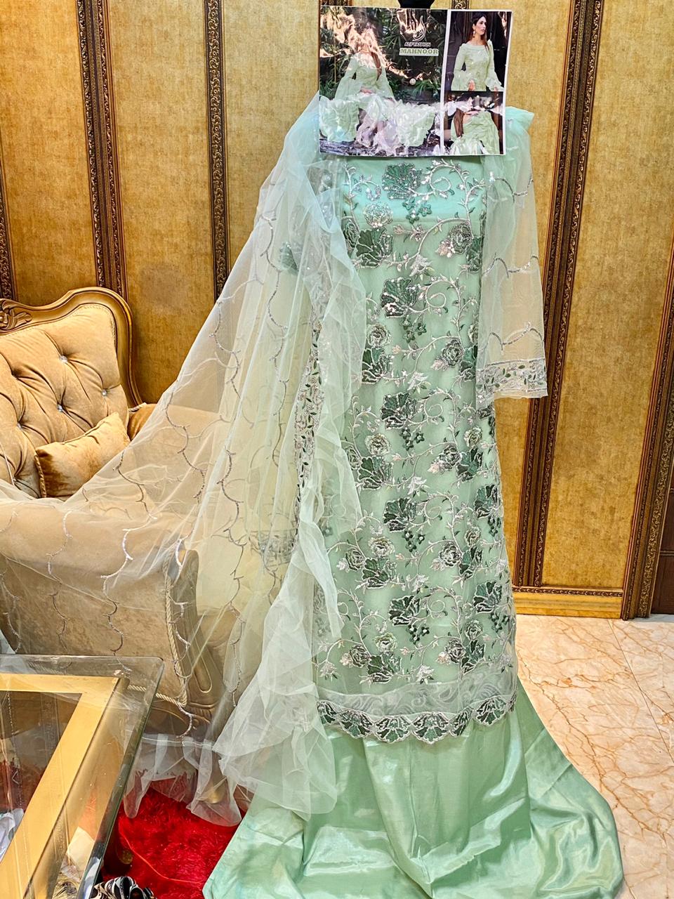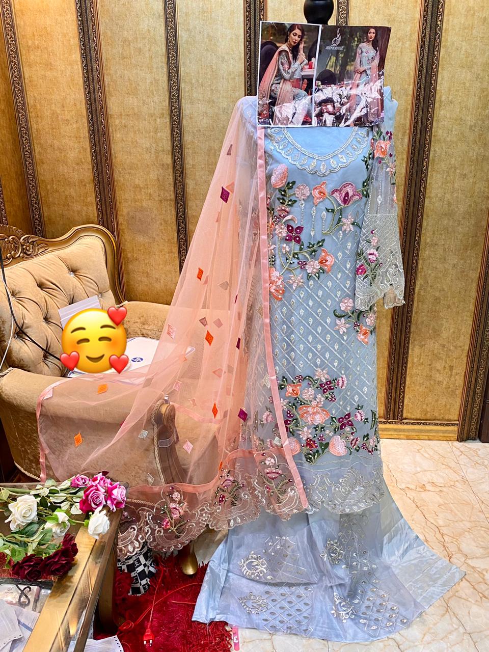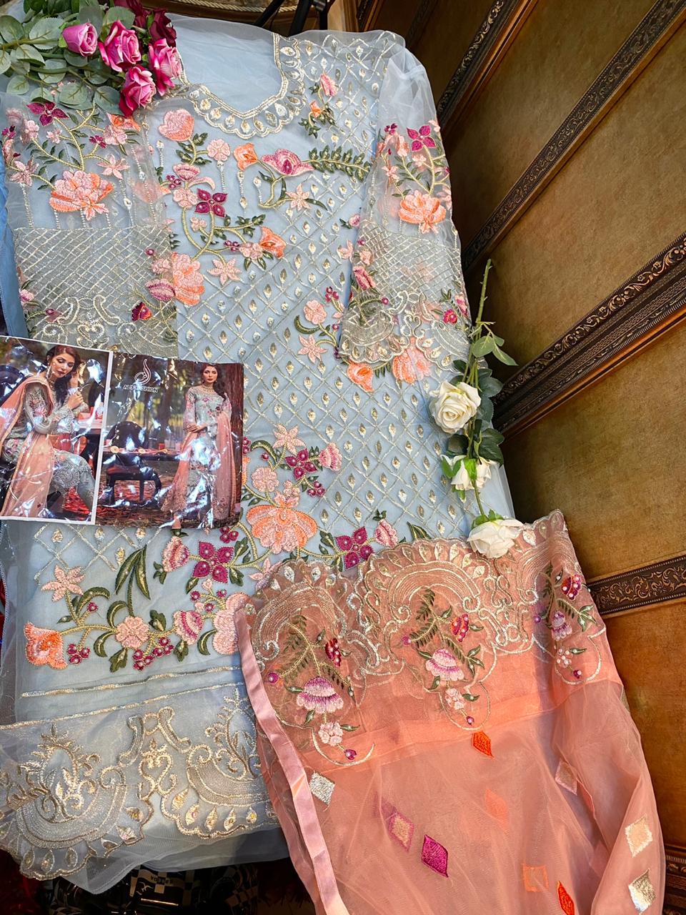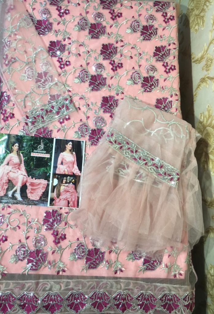 | DETAILS | Top:- Butterfly Nett with heavy sequence embroidery work with sequence embroidery patch in back Sleeve: Nett with heavy sequence embroidery work Bottom & inner : heavy santoon Dupatta: Butterfly net with sequence embroidery work with four side fancy Frill border |