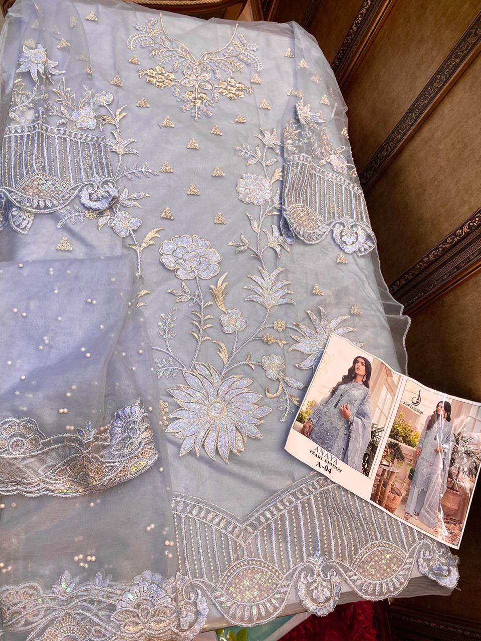 | DETAILS | Fabric details ?? Sleeve: Nett with heavy sequence embroidery work with pearl work Bottom & inner : heavy santoon Dupatta: Butterfly net with sequence embroidery work with full pearl work |
