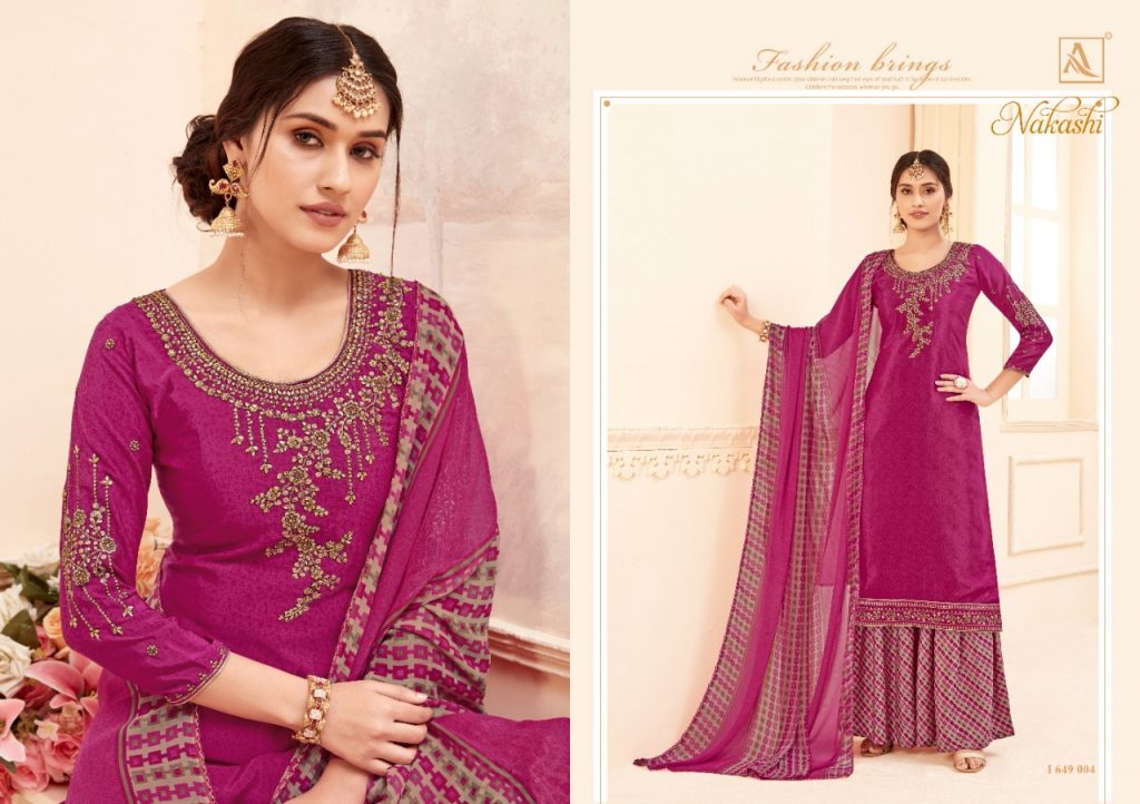 | DETAILS | ? *Alok Suit – Make in India* ? Launches its New Catalog: *NAKASHI* *Fabric Details:* ? Bottom: Pure Fine Crep Patiyala Salwar ? *DUPPATTA: Pure Georgette Fancy Print Dupatta with Four Side Lace* ?The single set has: 8️⃣Pcs Rate – ₹ 8️⃣2️⃣5️⃣+ 5⃣% GST With Fancy ?Bag Packing Happy Shopping… |