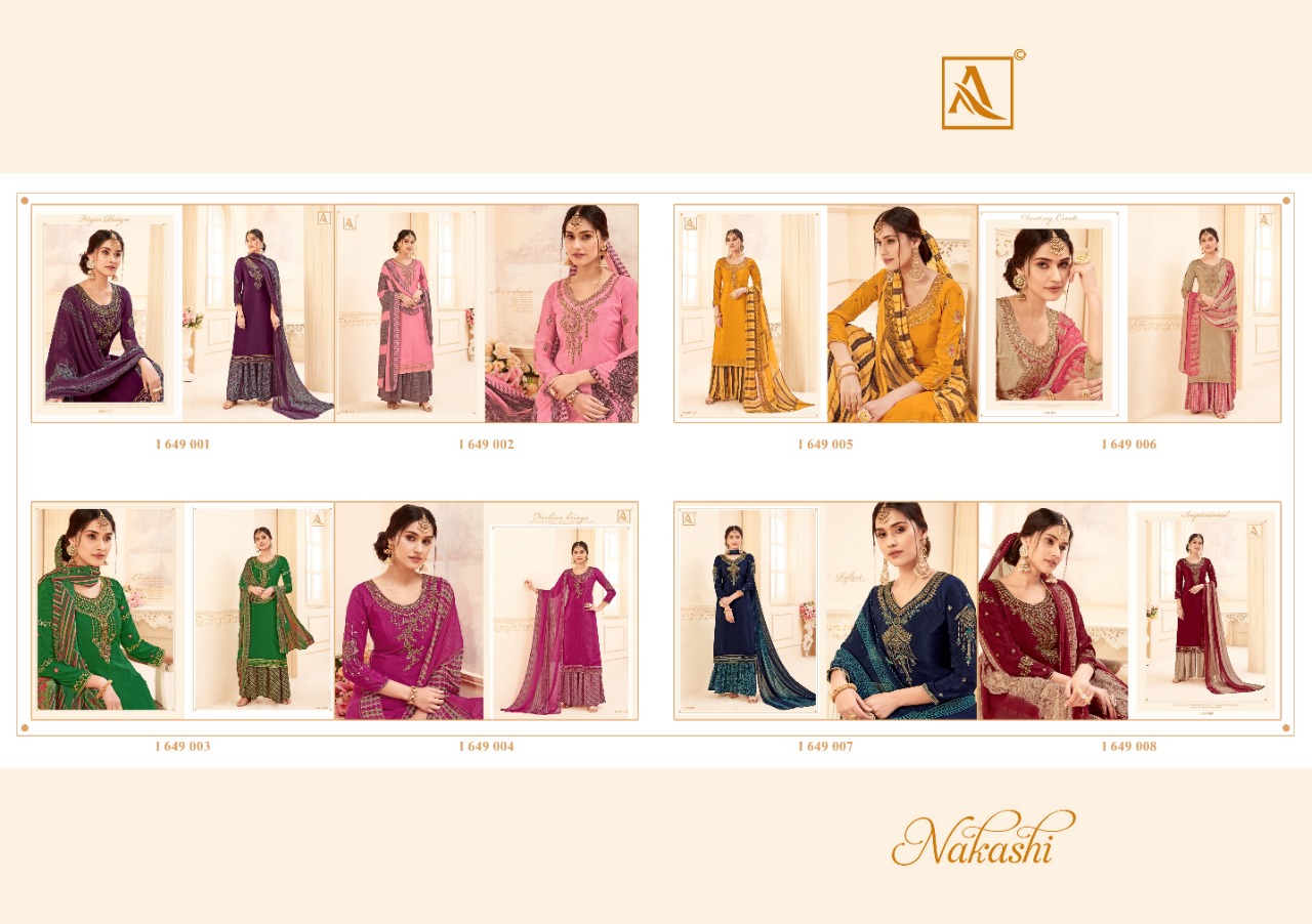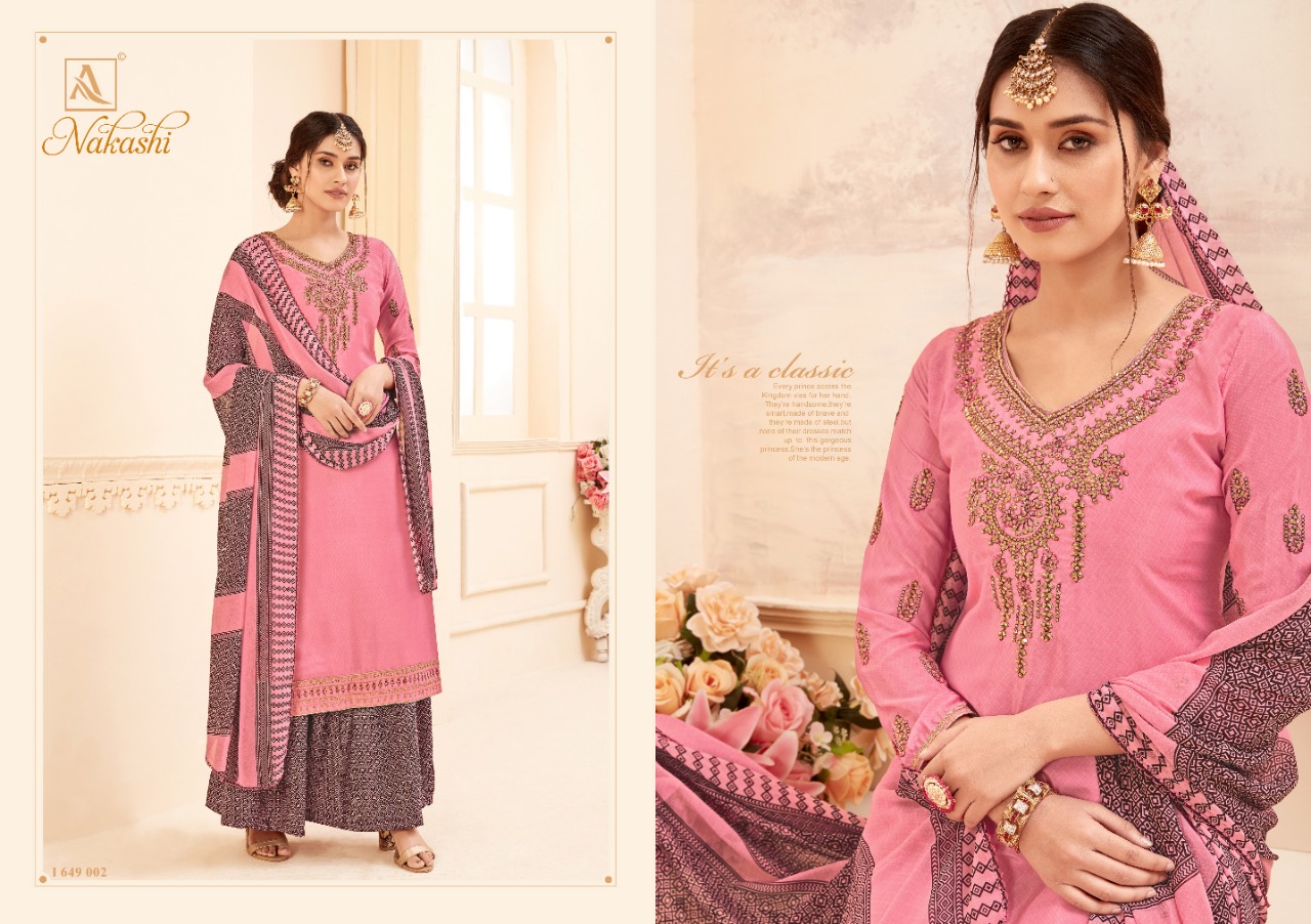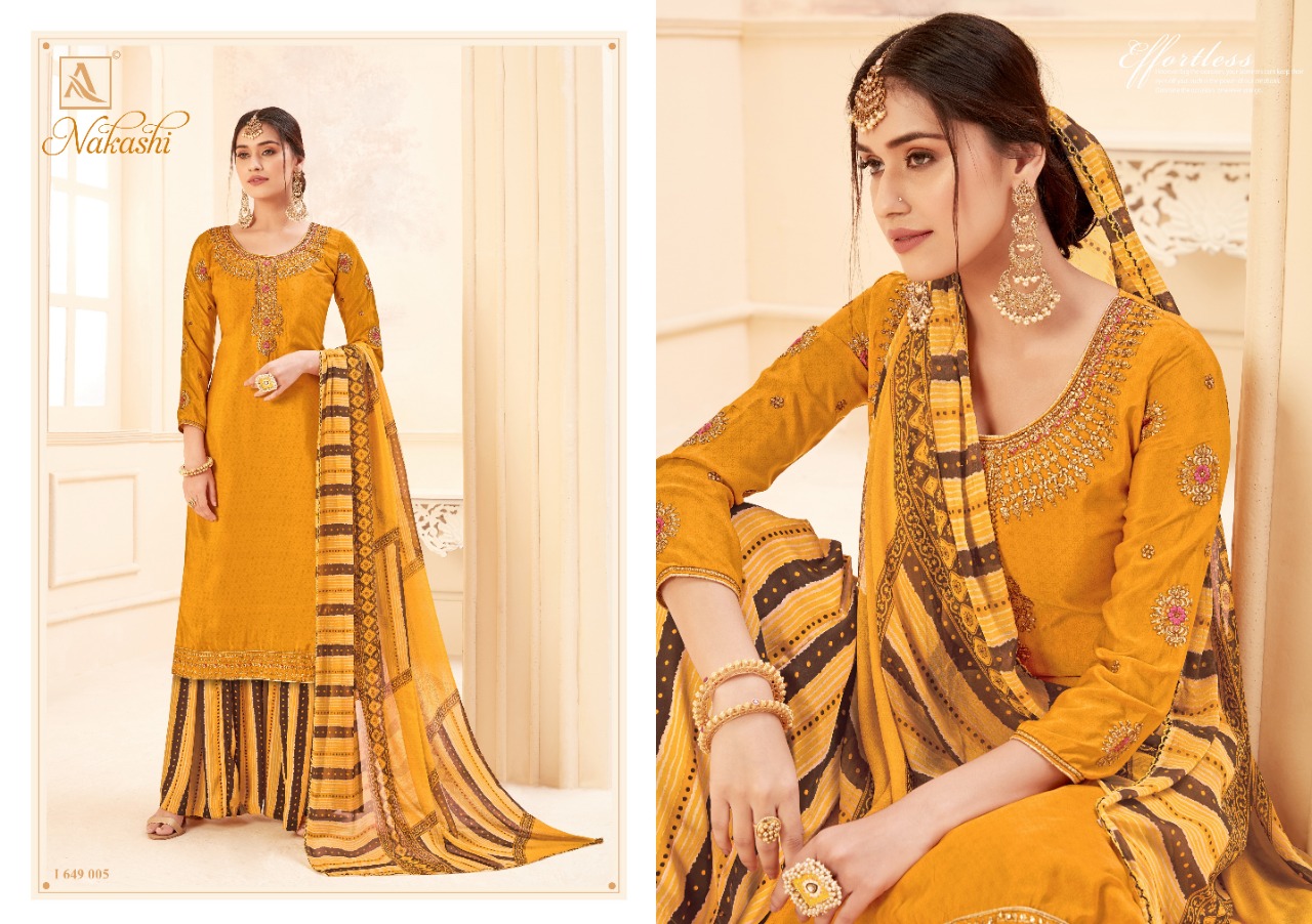 | DETAILS | ? *Alok Suit – Make in India* ? Launches its New Catalog: *NAKASHI* *Fabric Details:* ? Bottom: Pure Fine Crep Patiyala Salwar ? *DUPPATTA: Pure Georgette Fancy Print Dupatta with Four Side Lace* ?The single set has: 8️⃣Pcs Rate – ₹ 8️⃣2️⃣5️⃣+ 5⃣% GST With Fancy ?Bag Packing Happy Shopping… |