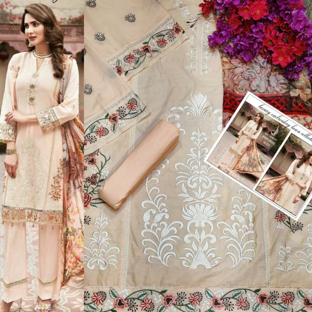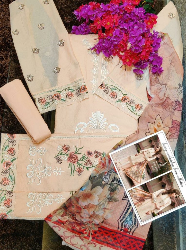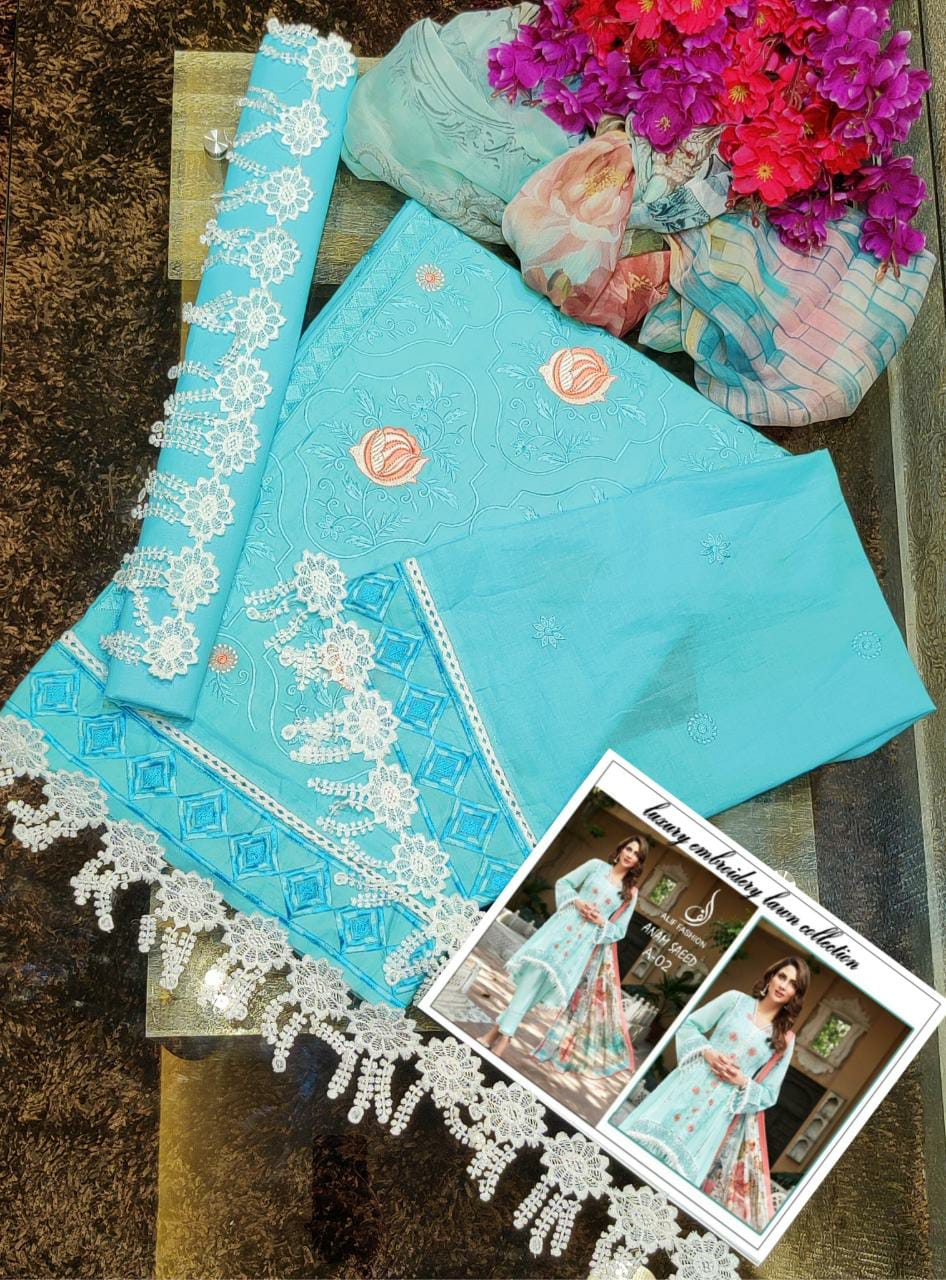 | DETAILS | Top: Pure cemric cotton with heavy embroidery work and lace Sleeve: pure camric cotton with heavy embroidery Bottom: semi lawn Dupatta: pure chiffon digital printed |