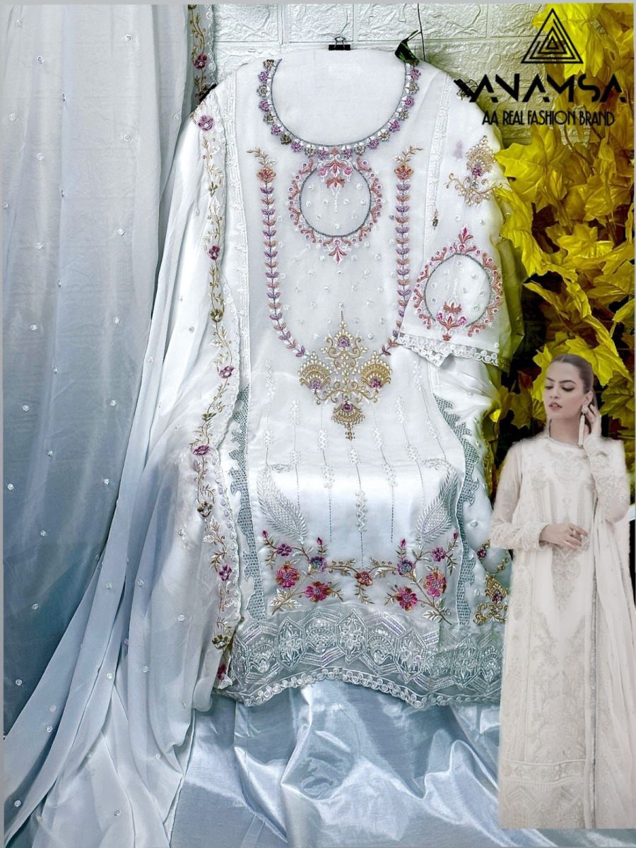 FABRIC DETAILS :- Heavy Pure Fox Georgette With Heavy Embroidered Very Beautiful Design And Sequence Work High Quality MaterialVery Beautiful Semi Stitched OutfitUnstitched Heavy Dull Shantoon BottomVery Beautiful Pure Fox Georgette Heavy Fancy Dupatta with Fancy EmbroideryInner- Dull ShantoonANAMSA 267 PAKISTANI SUITS MANUFACTURER