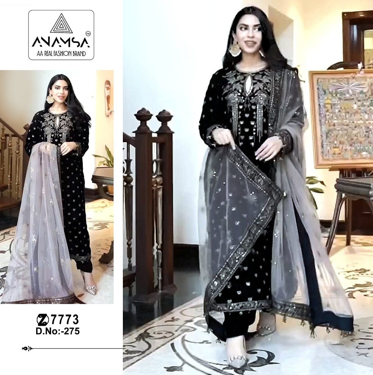 FABRIC DETAILS :- Heavy Pure Velvet 9000 With Heavy Embroidered Very Beautiful Design And Sequence Work High Quality MaterialVery Beautiful Semi Stitched OutfitUnstitched Heavy Dull Shantoon BottomVery Beautiful Pure Organza Heavy Fancy Dupatta with Fancy EmbroideryANAMSA 275 VELVET SUITS MANUFACTURER