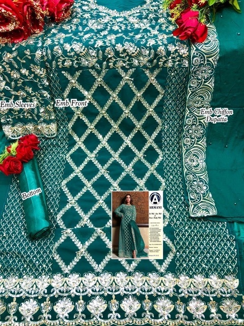| DETAILS | Top : *FRONT* Fox georgett with heavy embroidery and heavy sequance work with daman sequance work with fully handwork hand attech moti and diamond *BACK* plain *SLEEVES* Fox georgett with embroidery and sequance work *NECK* Embroidery and sequance workBottom : SantoonInner : *Available* SantoonDupatta : Nazmeen with embroidery work and attech moti*Price:- Rs 1250/-* |