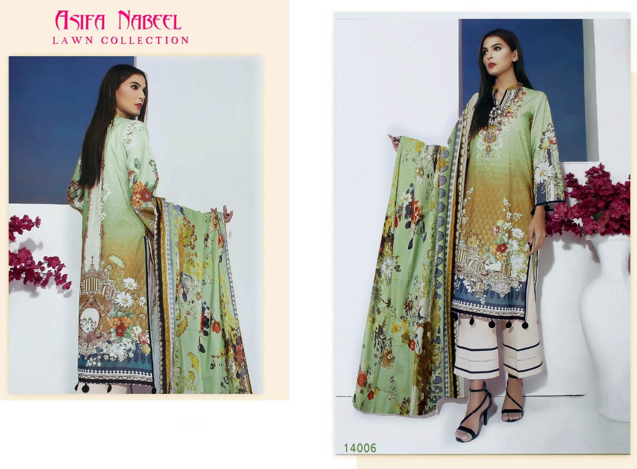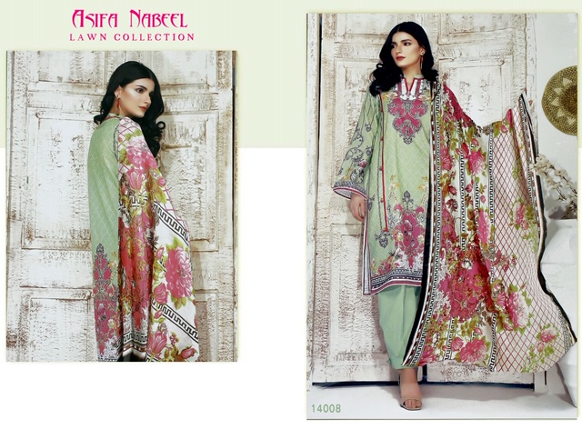 | DETAILS | ASIFA NABEEL *Pure lawn collection with mal mal duppata* ?Top : Pure Lawn (cut:2.25 mtr) ?Bottom : pure lawn (cut:2 mtr) ?Dupatta: Pure Cotton Mal Mal (cut 2.25 mtr) Designs : 08/-pcs set *Rate : 349+ GST* |