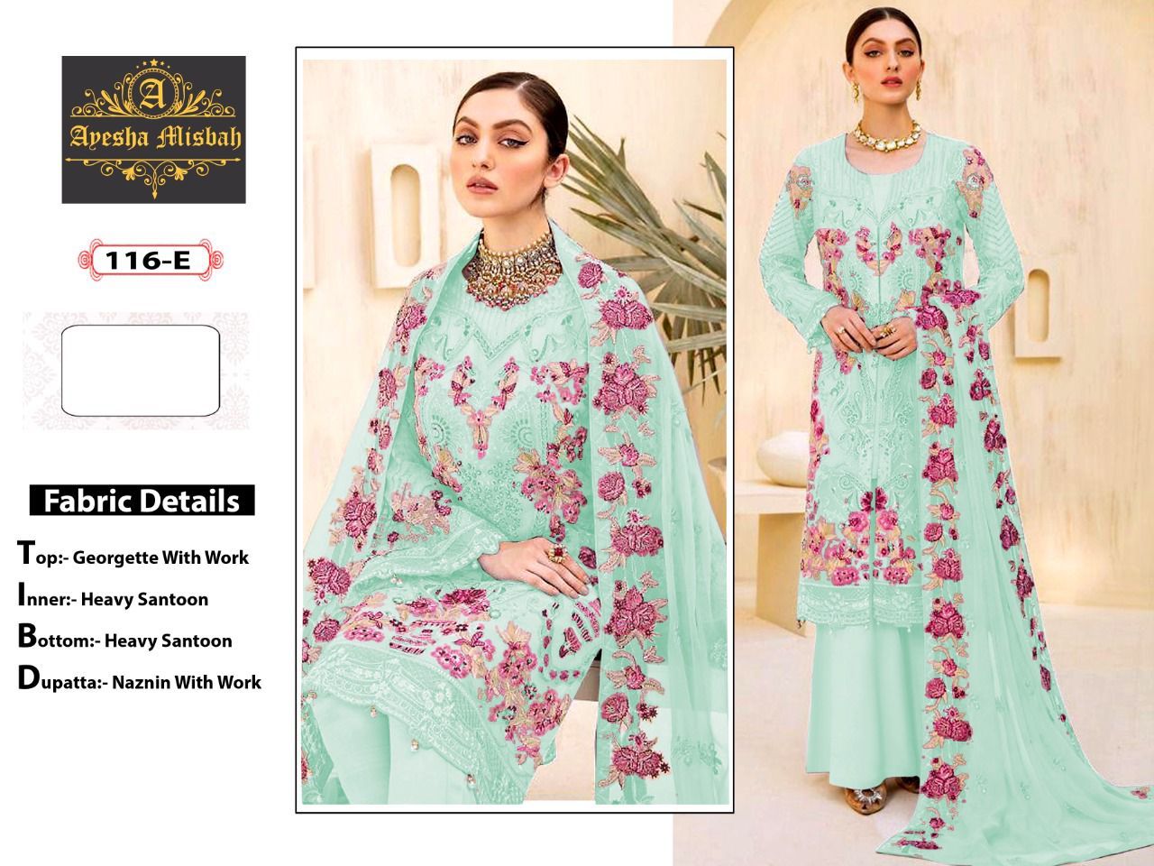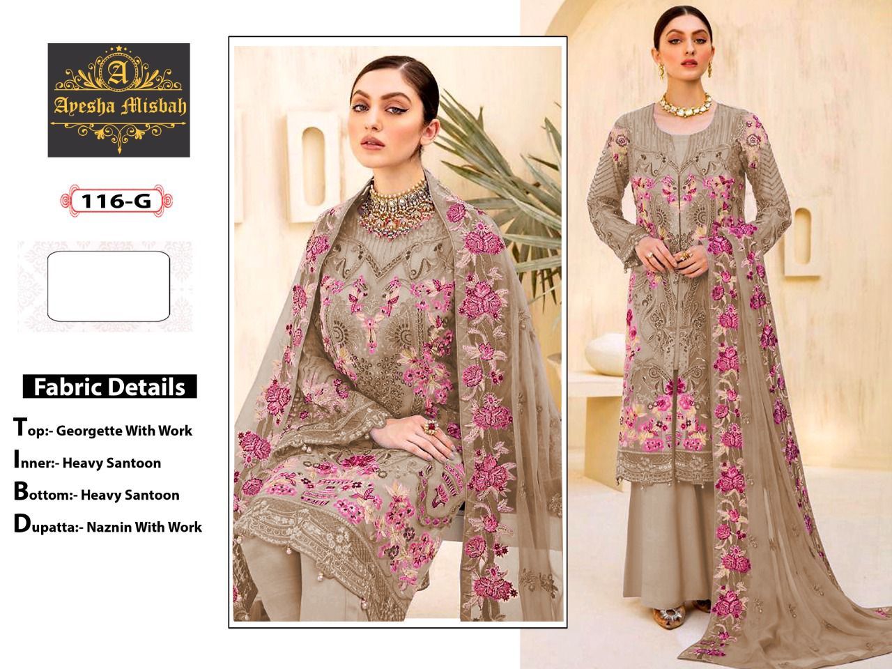 | DETAILS | *Fabric details Top : heavy georgette fabric with work Hand work on workBottom : SANTOONinner : SANTOONDupatta :naznin fabric with work |