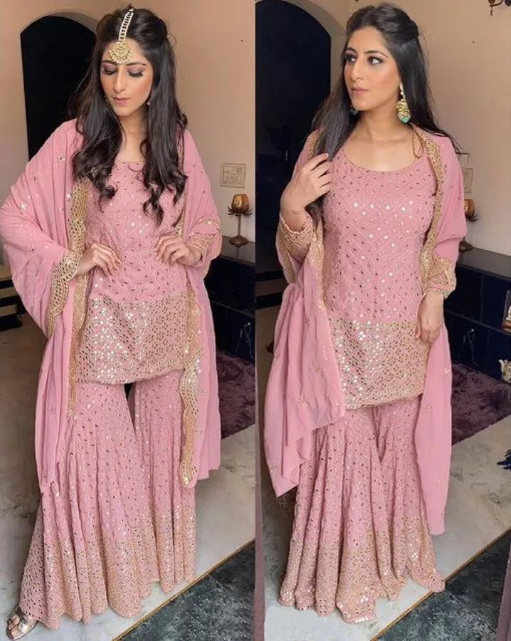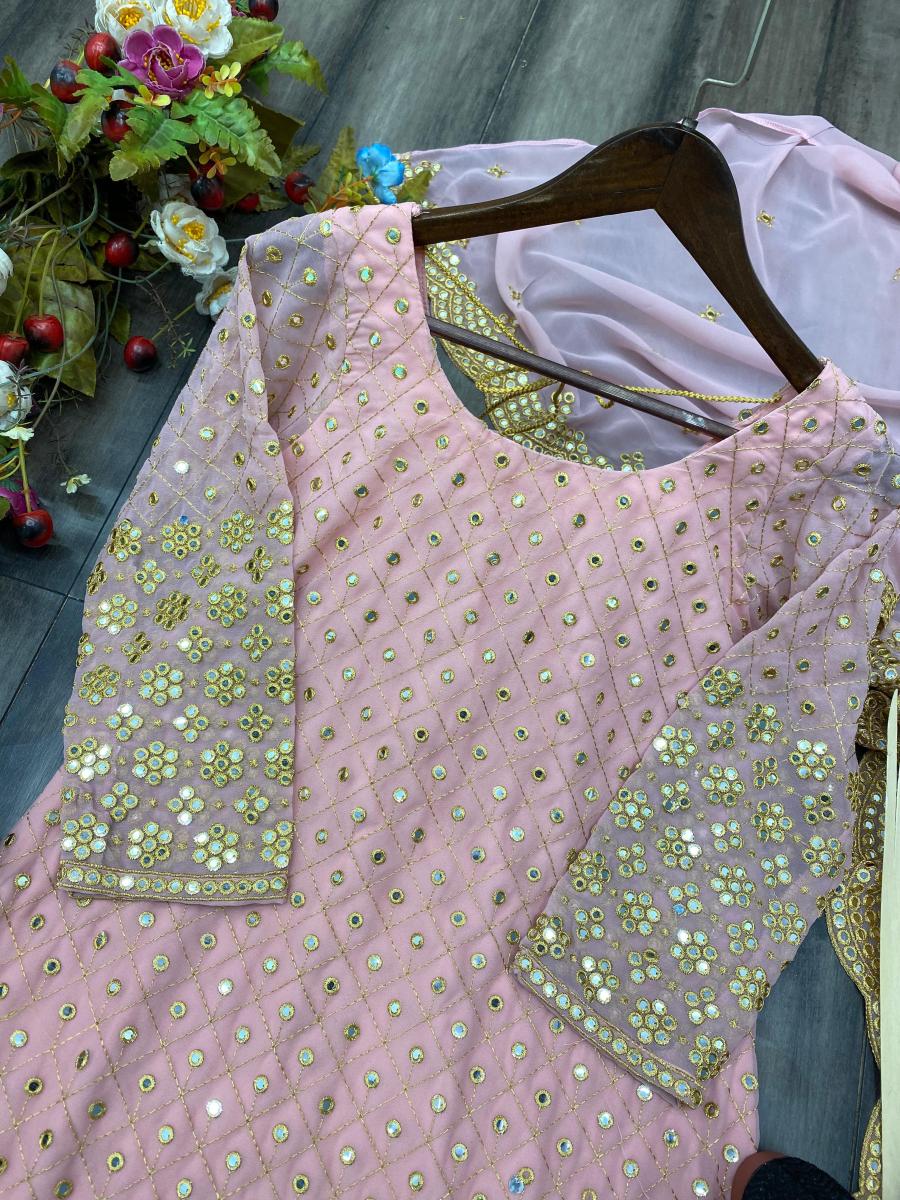 | FABRIC DETAILS | # SUIT FABRICS : GEORGETTE # TOP INNER : SILK # WORK : 9mm SEQUANCE EMBROIDERY WORK AND WITH FULL SLEEVES # HEIGHT: 37” inch # SIZE : S-36" M-38 “ L-40 “ XL-42 “ XXL-44 “# SARARA: GEORGETTE WITH 9mmSEQUANCE EMBROIDERY WORK FULL FLAIR FULL STITCHED FREE SIZE # HEIGHT: 40” inch# DUPATTA : GEORGETTE WITH 9mmSEQUANCE EMBROIDERY WORK 2.2meter |