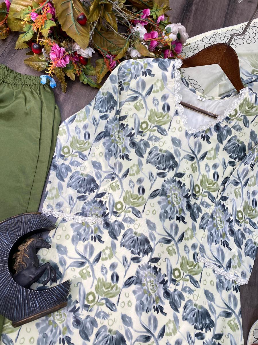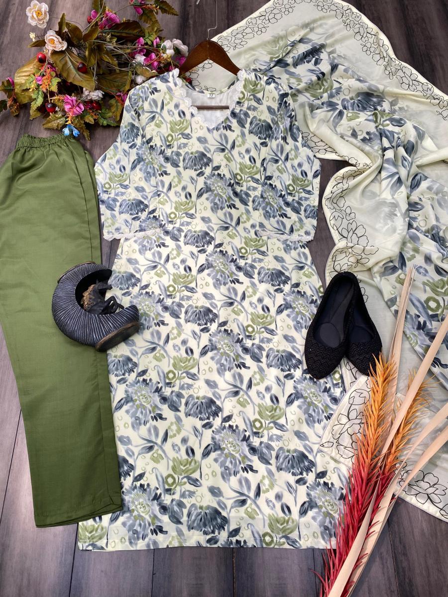 | FABRIC DETAILS | # SUIT FABRICS : MASLIN # TOP INNER : SILK # WORK : PRINT WITH GPO LACE WORK # HEIGHT: 45” inch # SIZE : M-38 “ L-40 “ XL-42 “ XXL-44 “# PANT: DULL SANTOON WITH FREE SIZE FULLSTITCHED # HEIGHT: 38” inch# DUPATTA : MASLIN WITH PRINTED WORK 2.2meter |