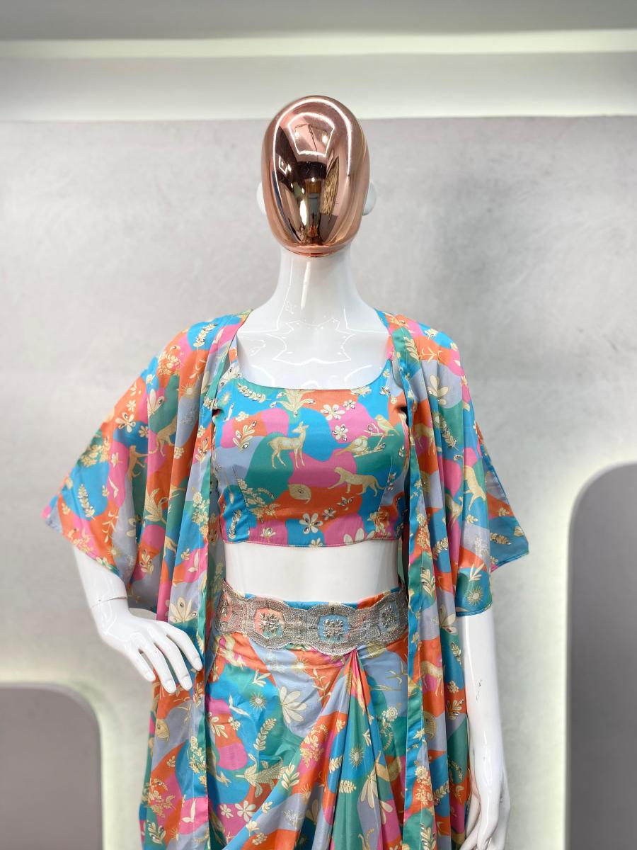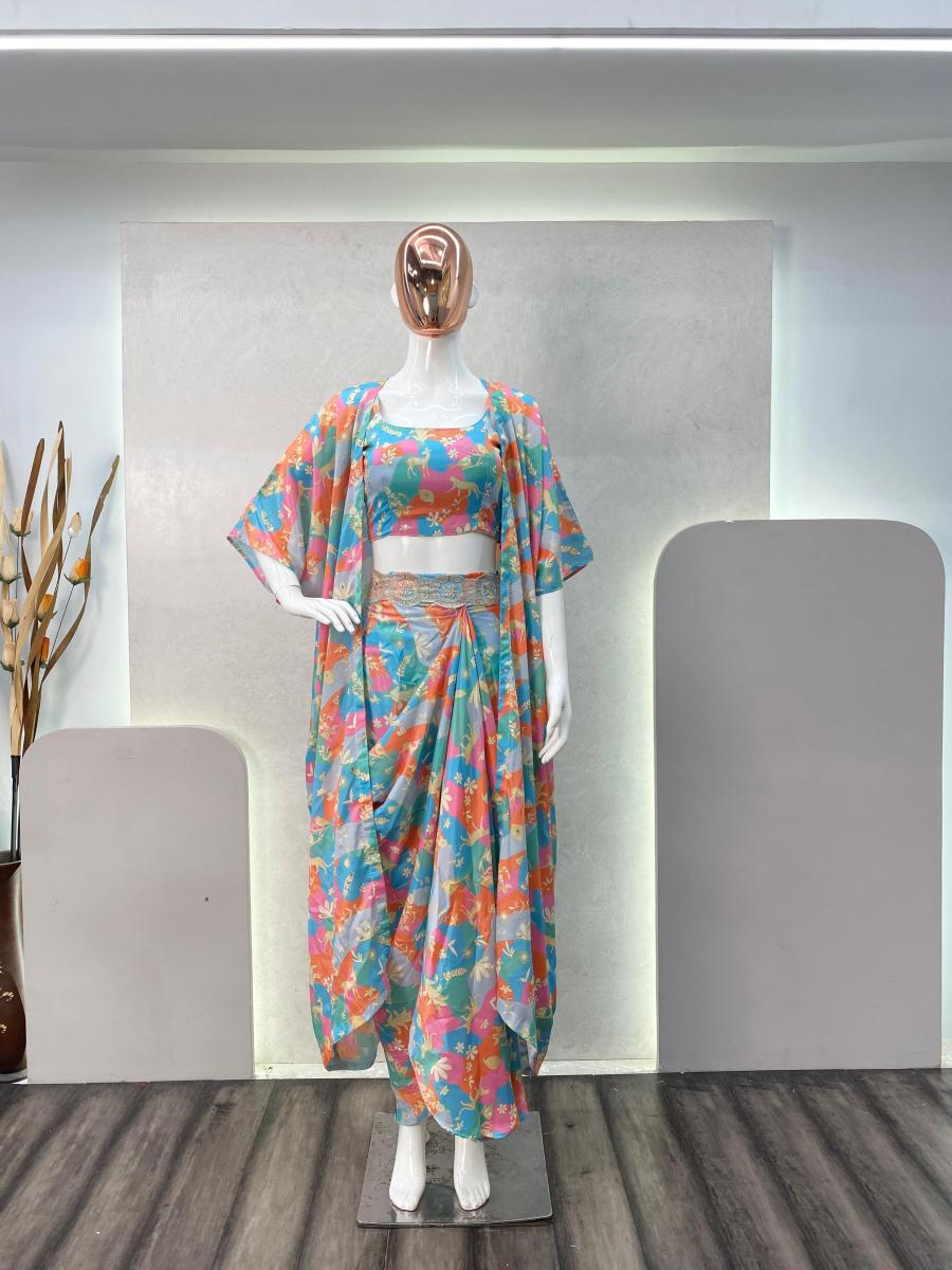 | FABRIC DETAILS | # KOTI FABRICS : CREAP SILK # WORK : PRINTED AND PAN MIROR WORK #HEIGHT : 55”inch #TOP SIZE : FREE SIZE OPEN SLEEVE#BOTTOM CREAP SILK WITH WESTERN STYLE FULLSTITCHED BOTTOM FREE SIZE HEIGHT : 41” inch# BLOUSE : CREAP SILK WITH PRINT AND PAN MIROR WORK FULLSTITCHED FREE SIZE |
