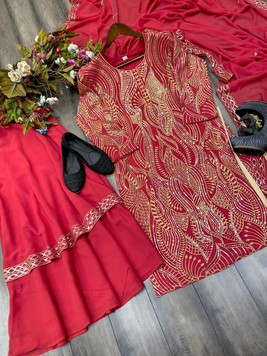 | FABRIC DETAILS | # SUIT FABRICS : FAUX GEORGETTE WITH SEQUENCE EMBROIDERY WORK # TOP INNER : SILK # WORK : SEQUANCE EMBROIDERY # HEIGHT: 40” inch #TOP SIZE : M-38” ,L-40” , XL-42” , XXL-44”#PLAZO FAUX GEORGETTE WITH SEQUANCE EMBROIDERY RUFFLE WORK FULLSTITCHED FREE SIZE# DUPATTA : FAUX GEORGETTE WITH SEQUANCE EMBROIDERY WORK 2.2meter |