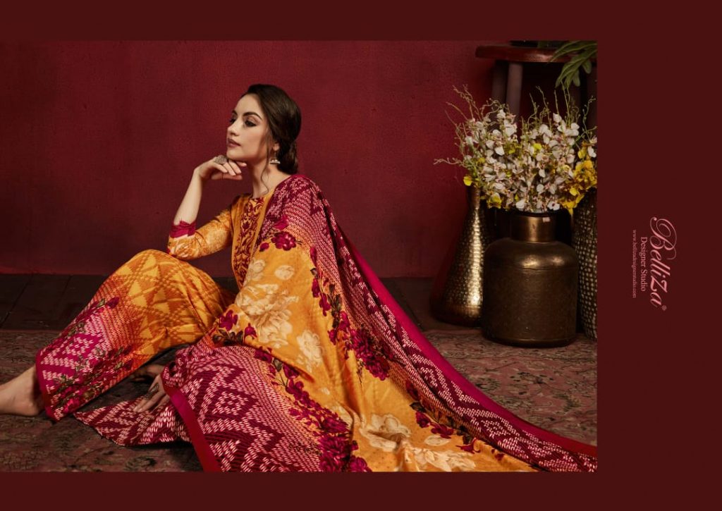 | DETAILS | BelliZa DesigNer StuDio _presents_ *”NAZAKAT”* ♦️Top: 100% Pure Pashmina Digital Style Print (2.50 mtrs) ♦️Dupatta: Pure Pashmina Shawl (2.30 mtr) ♦️Bottom: Pure Pashmina Designer Print Salwar (3 mtrs apx) ♦️Pcs: 10 ♦️Selling Rate: 541/- (GST extra) |