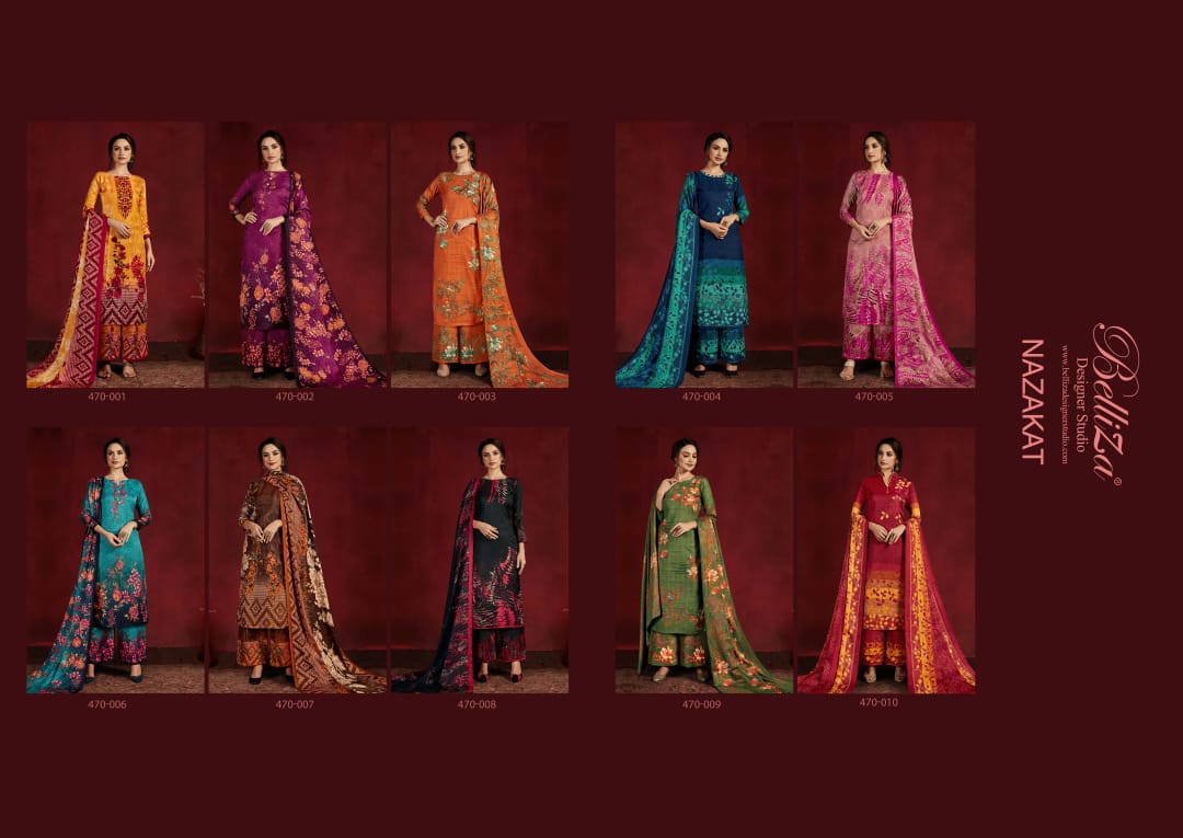 | DETAILS | BelliZa DesigNer StuDio _presents_ *”NAZAKAT”* ♦️Top: 100% Pure Pashmina Digital Style Print (2.50 mtrs) ♦️Dupatta: Pure Pashmina Shawl (2.30 mtr) ♦️Bottom: Pure Pashmina Designer Print Salwar (3 mtrs apx) ♦️Pcs: 10 ♦️Selling Rate: 541/- (GST extra) |