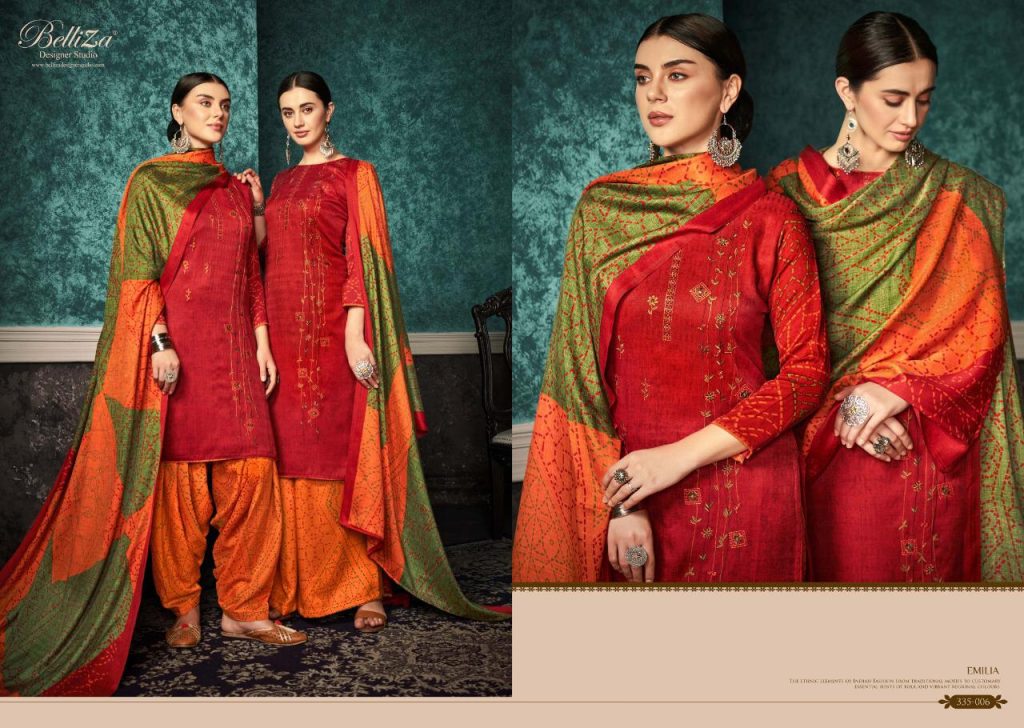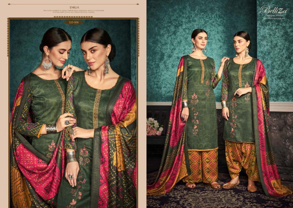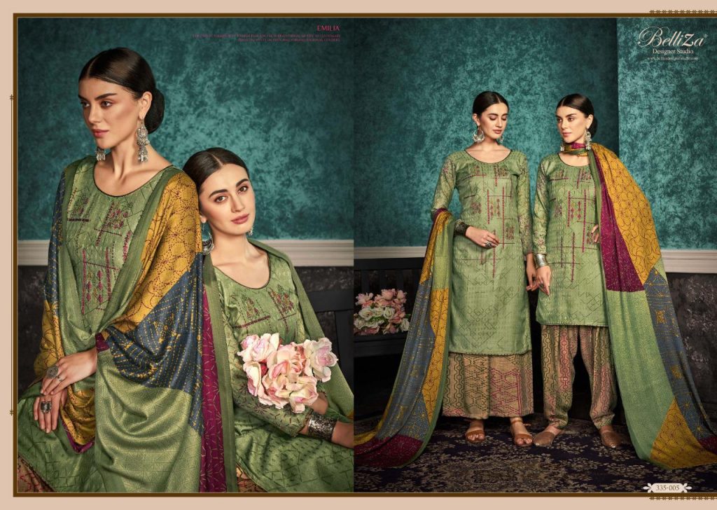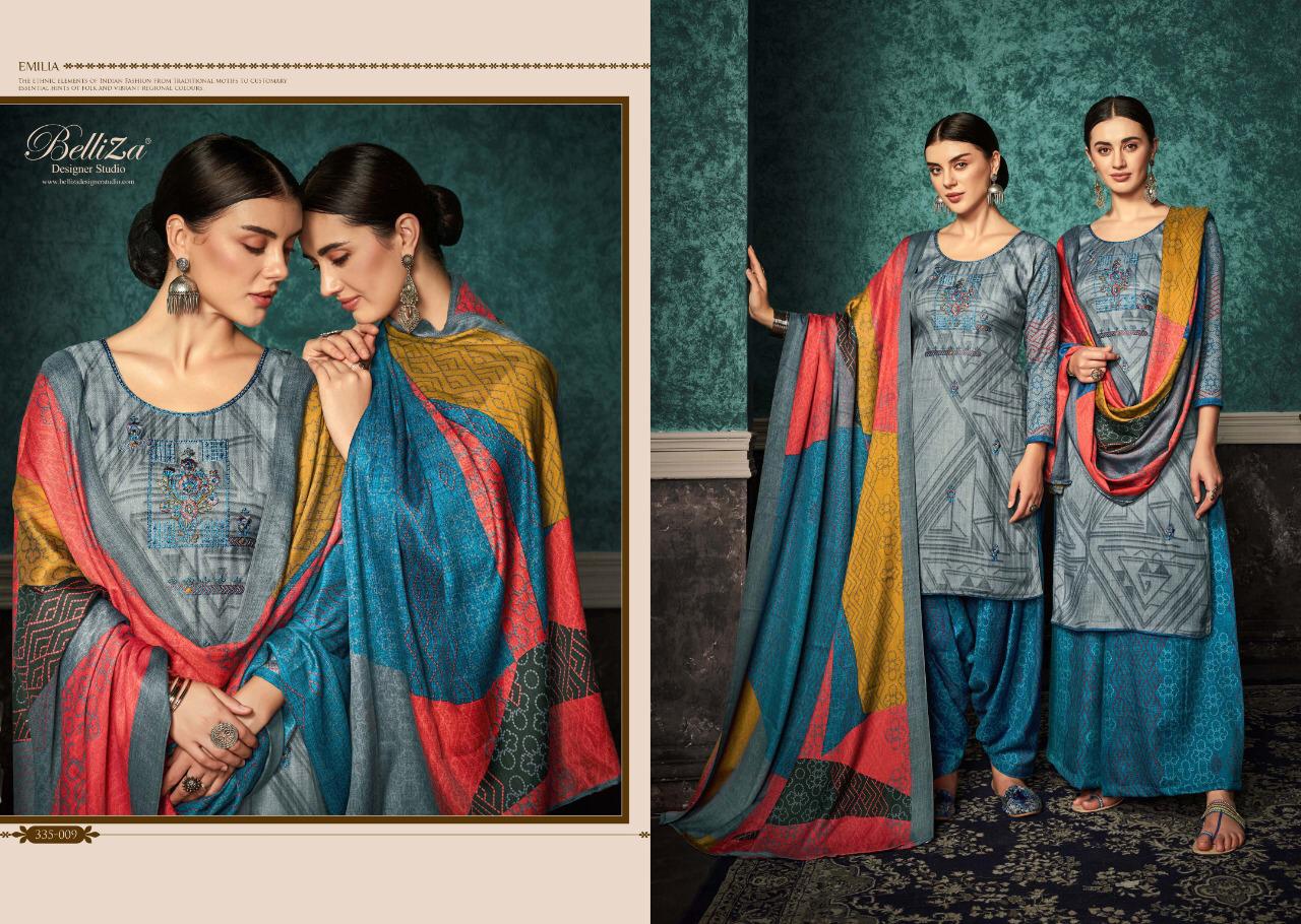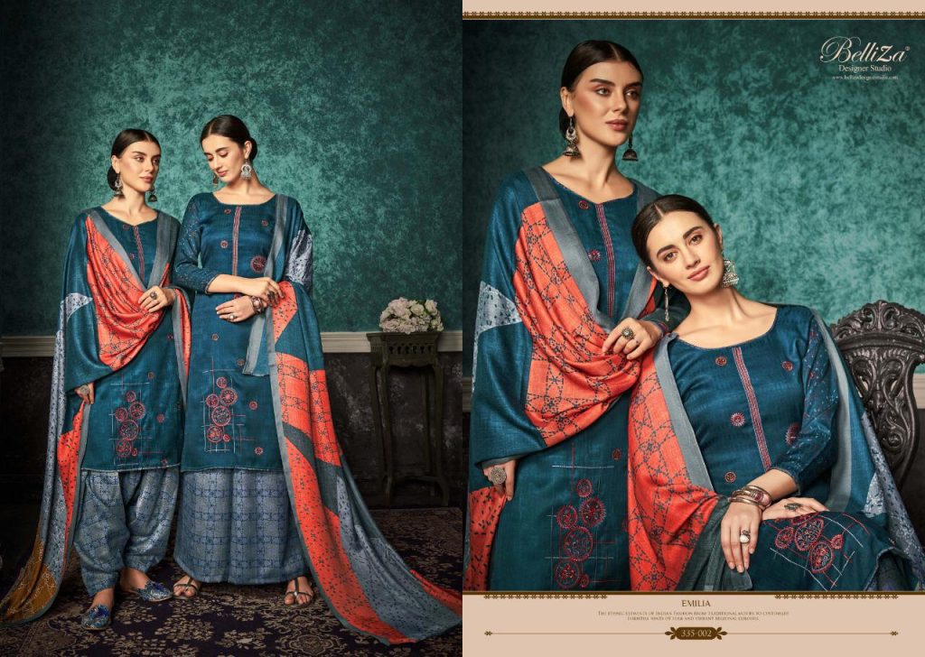 | DETAILS | #Pure Pashmina Patiala _*……BelliZa DesigNer StuDio……*_ _presents_ *”EMILIA”* ?Top: 100% Pure Pashmina Print with *Fancy Heavy Embroidery work* (2.50 mtrs) ?Dupatta: Pure Pashmina Fancy Pallu box Shawl with four side lace (2.30 mtr) ?Bottom: 100% pure pashmina Patiala Salwar (3 mtrs apx) ?Pcs: 10 ?Selling Rate: 599/- (GST extra) At Belliza, Quality Fabrics with exquisite designs at Best Price is our ‘Cherished Legacy’. |