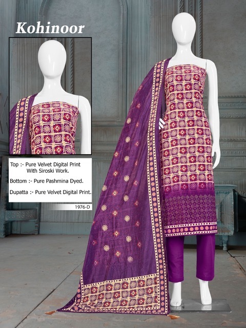 | DETAILS | ***FABRIC TOP :-* _ PURE VISCOSE Velvet 9000 Digital Print With Siroski Work 2.5 MTR*BOTTOM* :- _Pure VISCOS Pashmina Dyed 2.5 MTR*DUPATTA* :- Pure Velvet Digital Print 2.25 MTR |