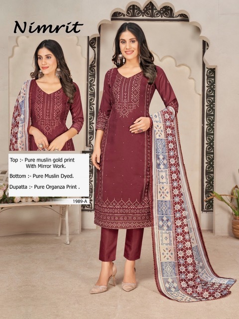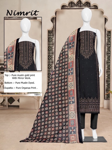 | DETAILS | ***FABRIC *TOP :-*Pure Muslin Gold Print With Mirror Work 2.5 MTR*BOTTOM* Pure Muslin Print 2.7 MTR*DUPATTA* Pure ORGANZA Print Beautiful 2.5 MTR |