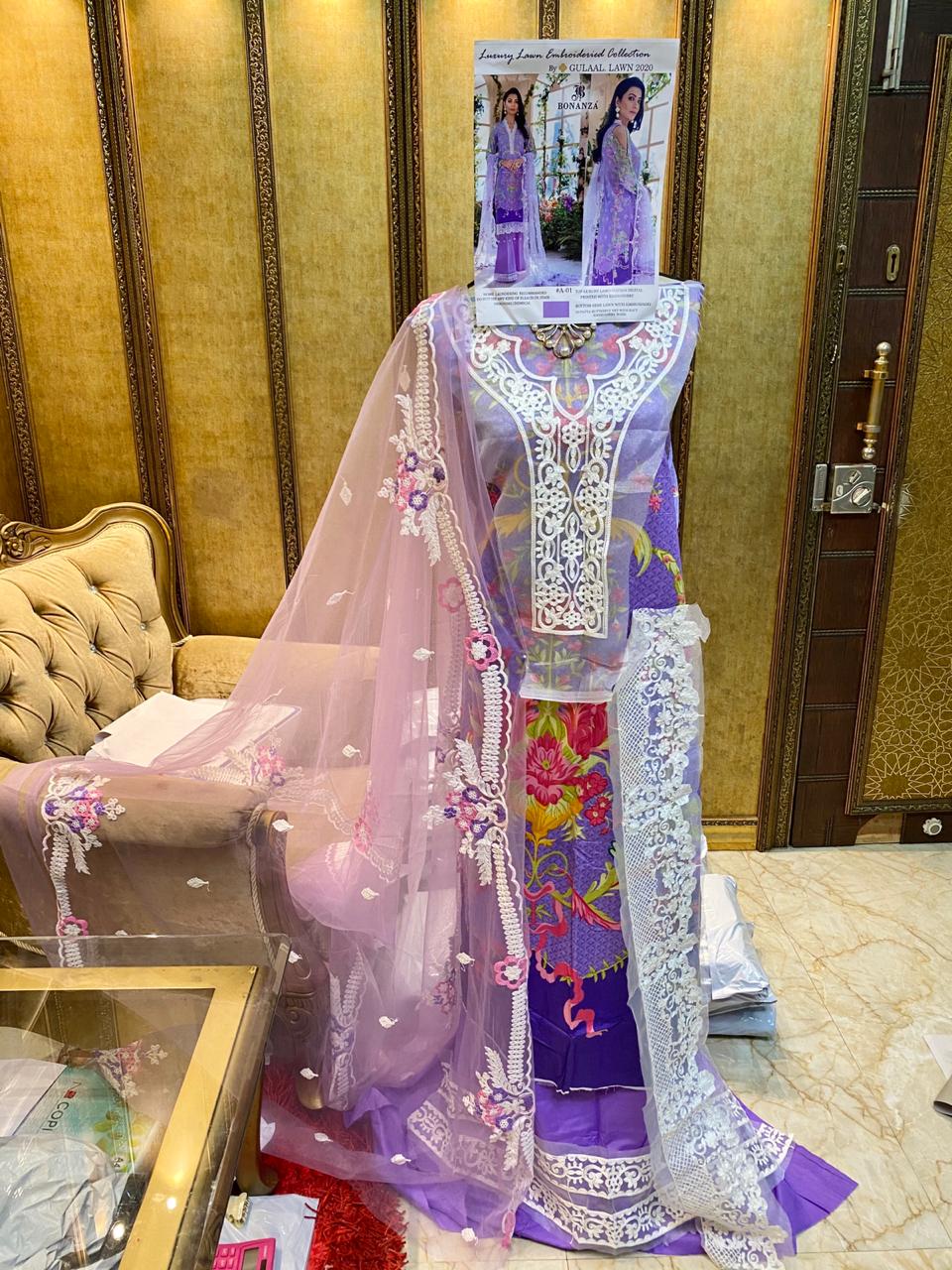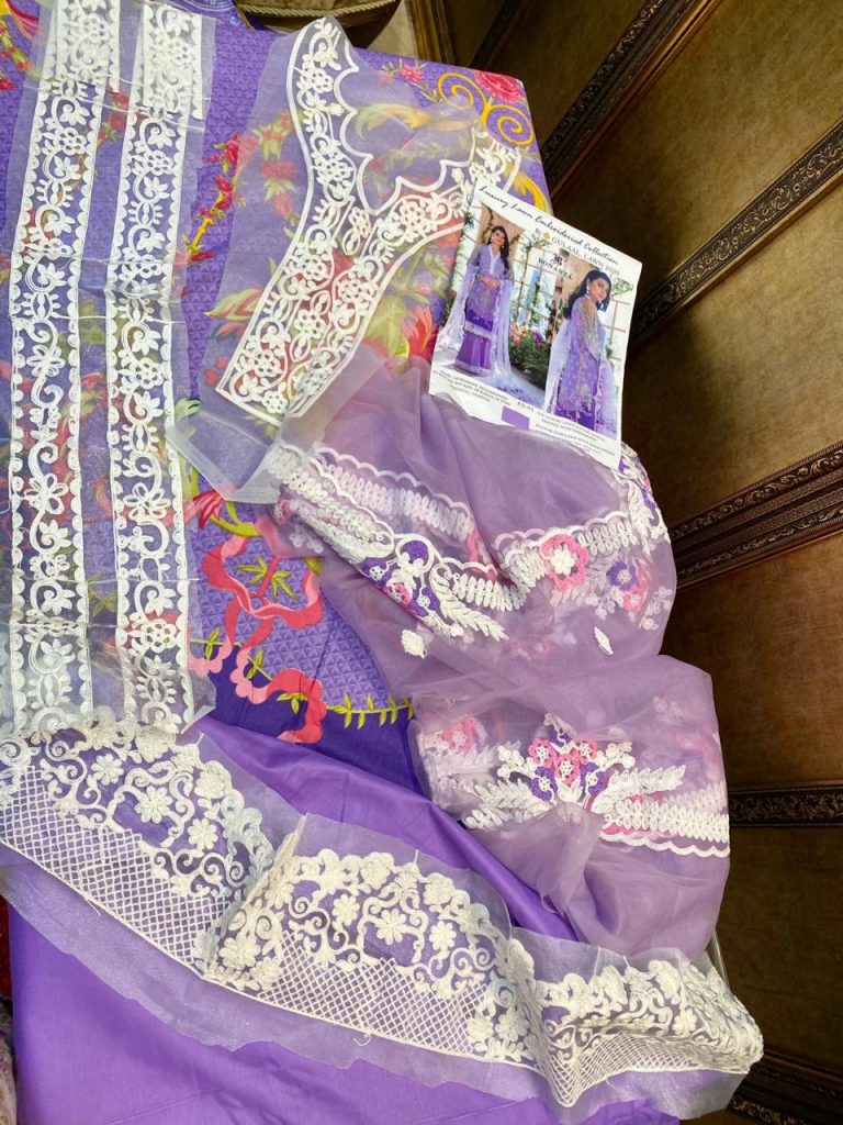 | DETAILS | Top: LAWN COTTON HEAVY mill print with havy embroidery work ?Bottom- semi lawn cotton with havy embroidery work ?Dupp: butterfly net with havy embroidery work |