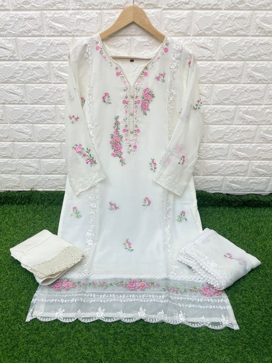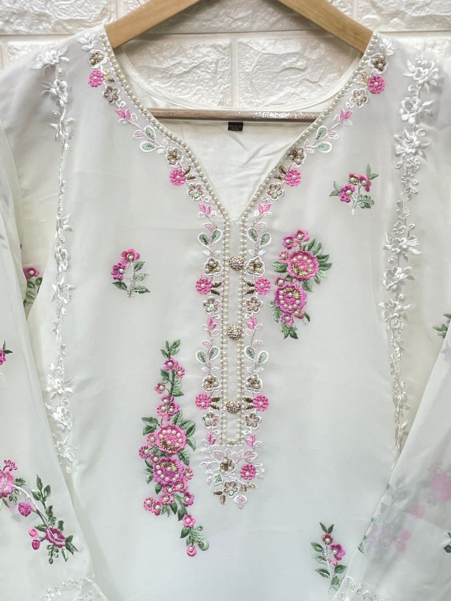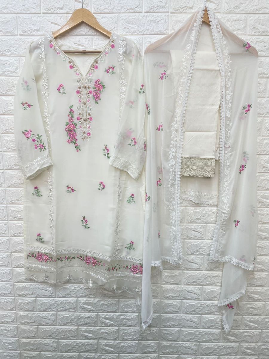 | DETAILS | Fabrics - *Top -Georgette with embroidery & handwork work with santoon innerBot -Cotton Lycra stiched pant styleDup -Pure Nazmeen chiffon with embroidery attached with laceSize- Xl (42”)with extra margin ( can be stiched up to 46”) |