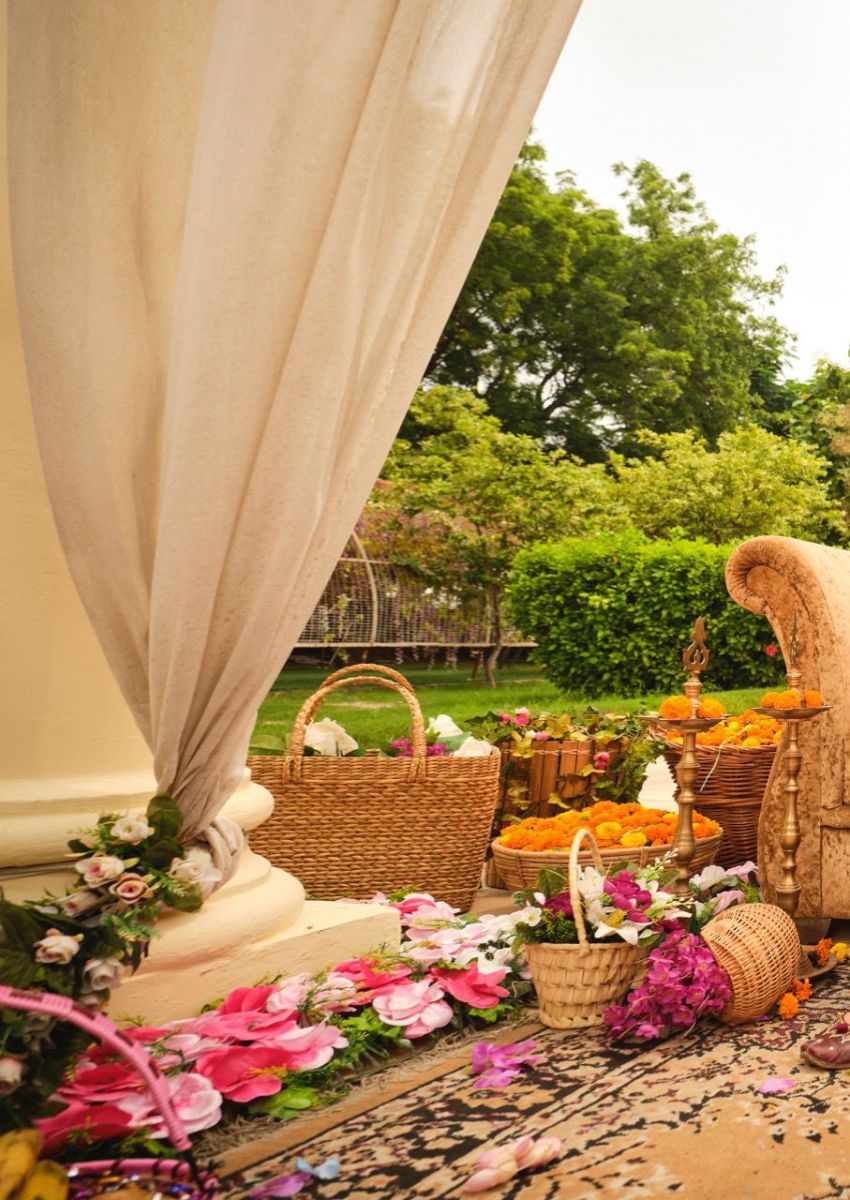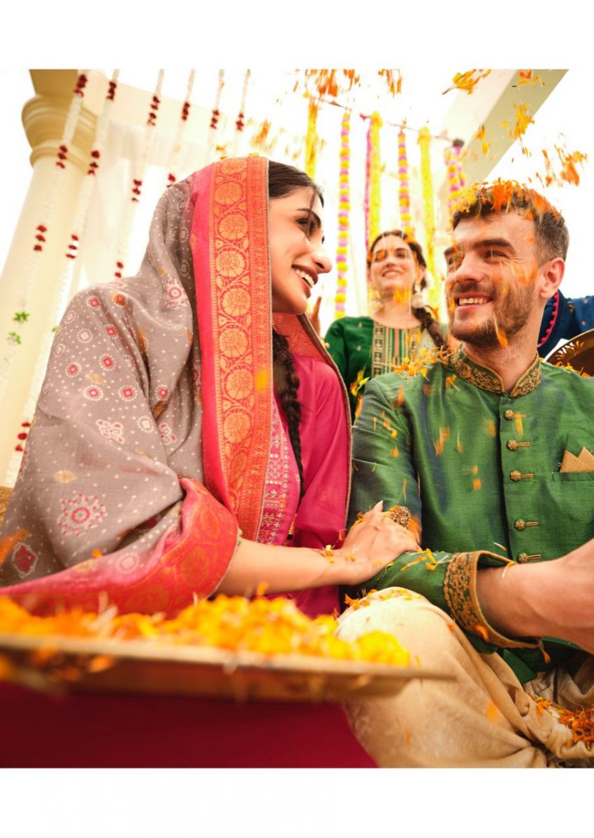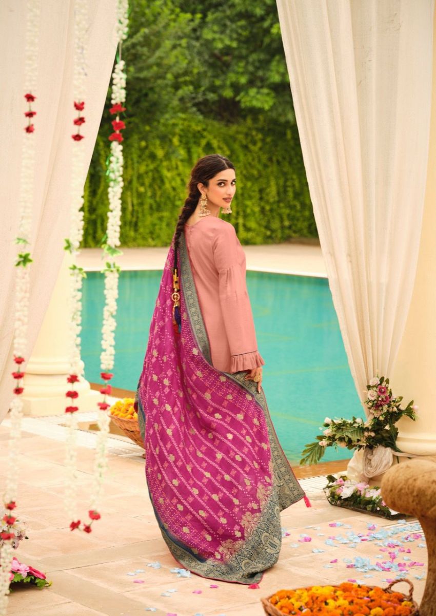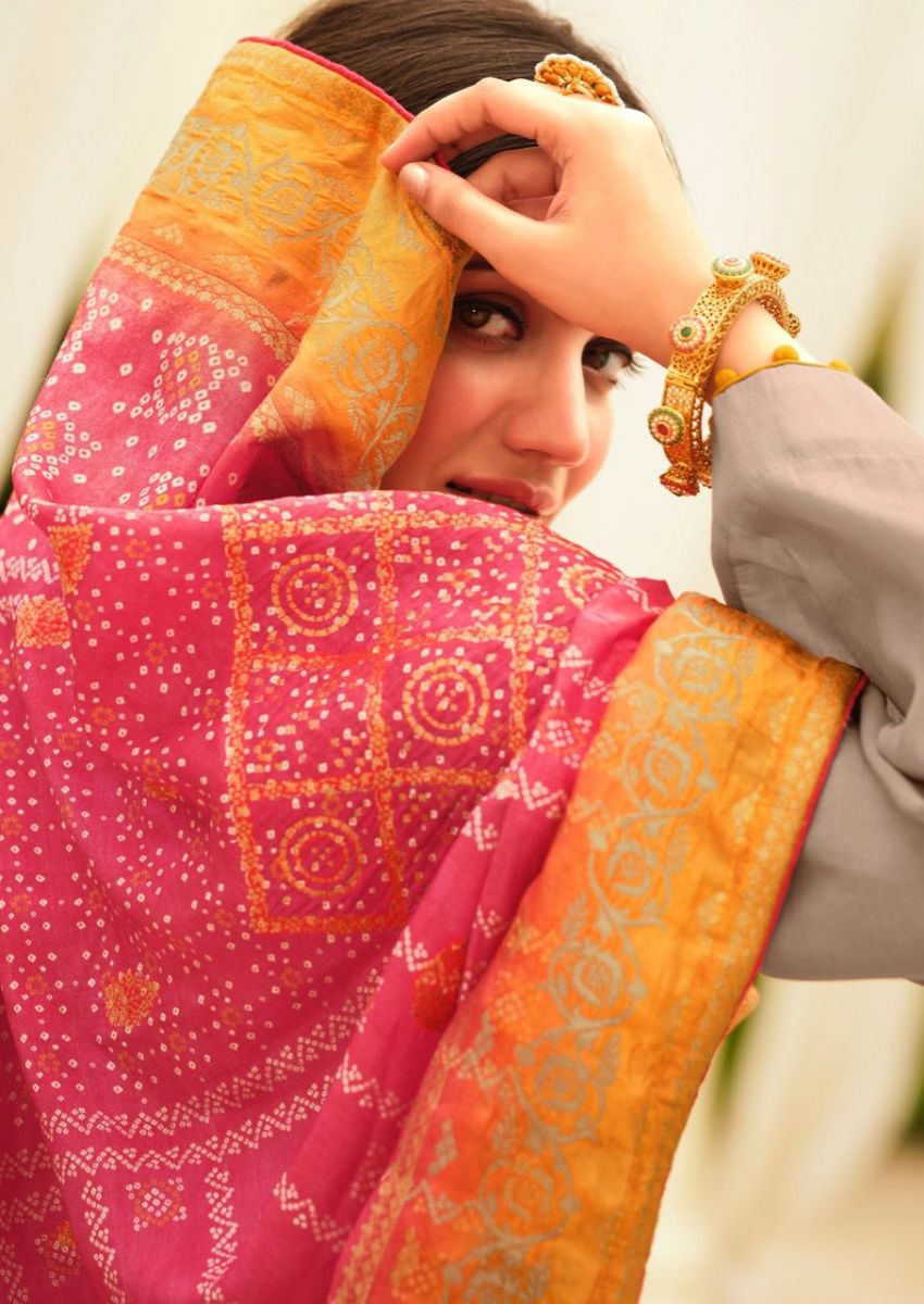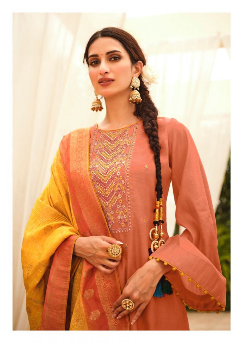 DETAILS Top - Tussar silk with embroideryBot -  Dull santoonDup - Dolla Jequard with bandhani inspired prints