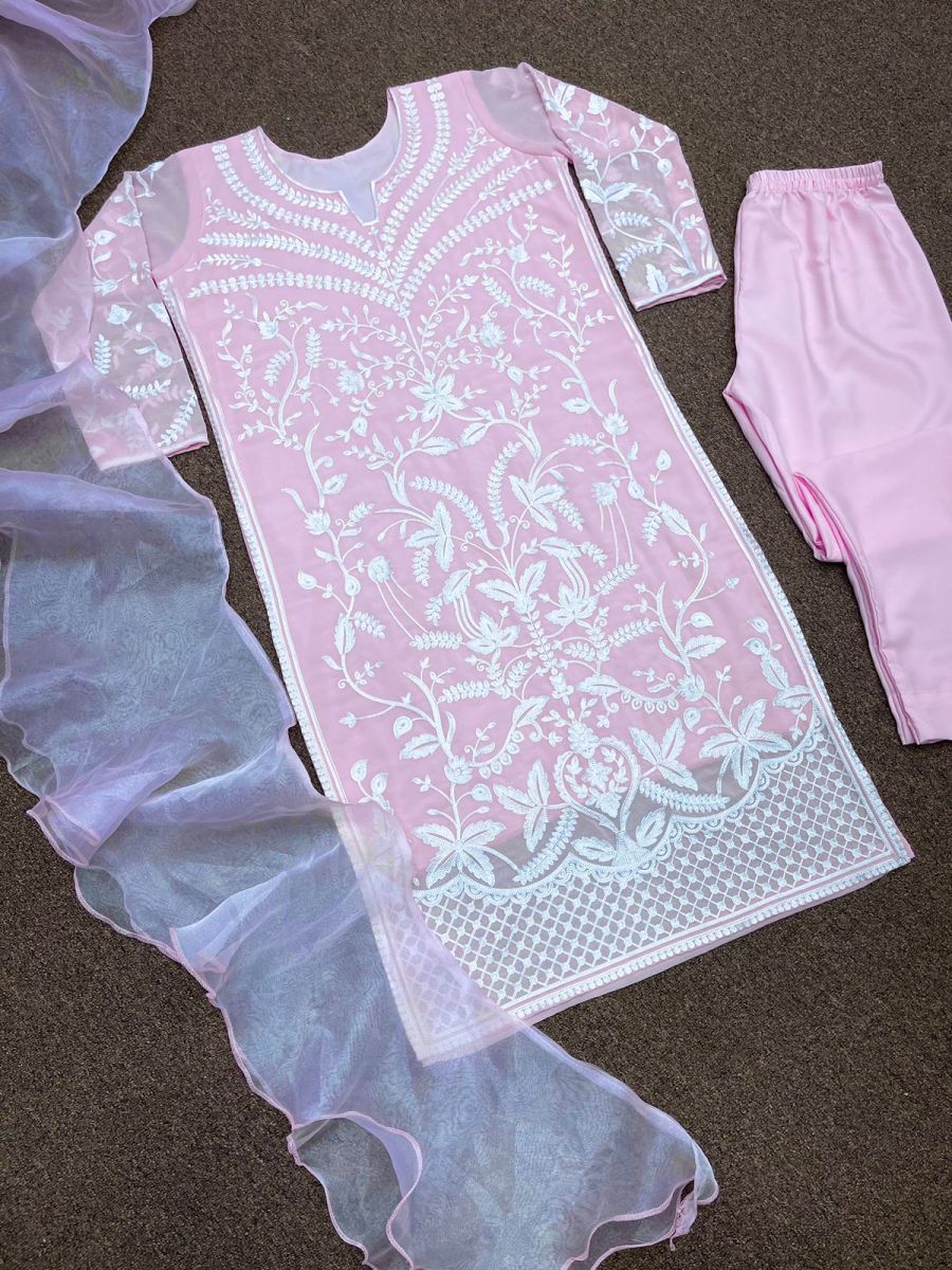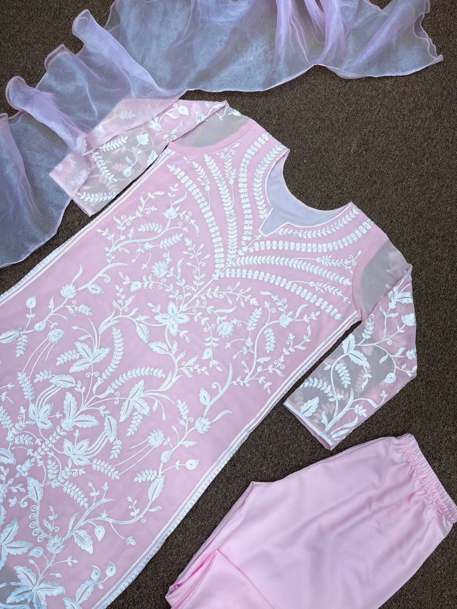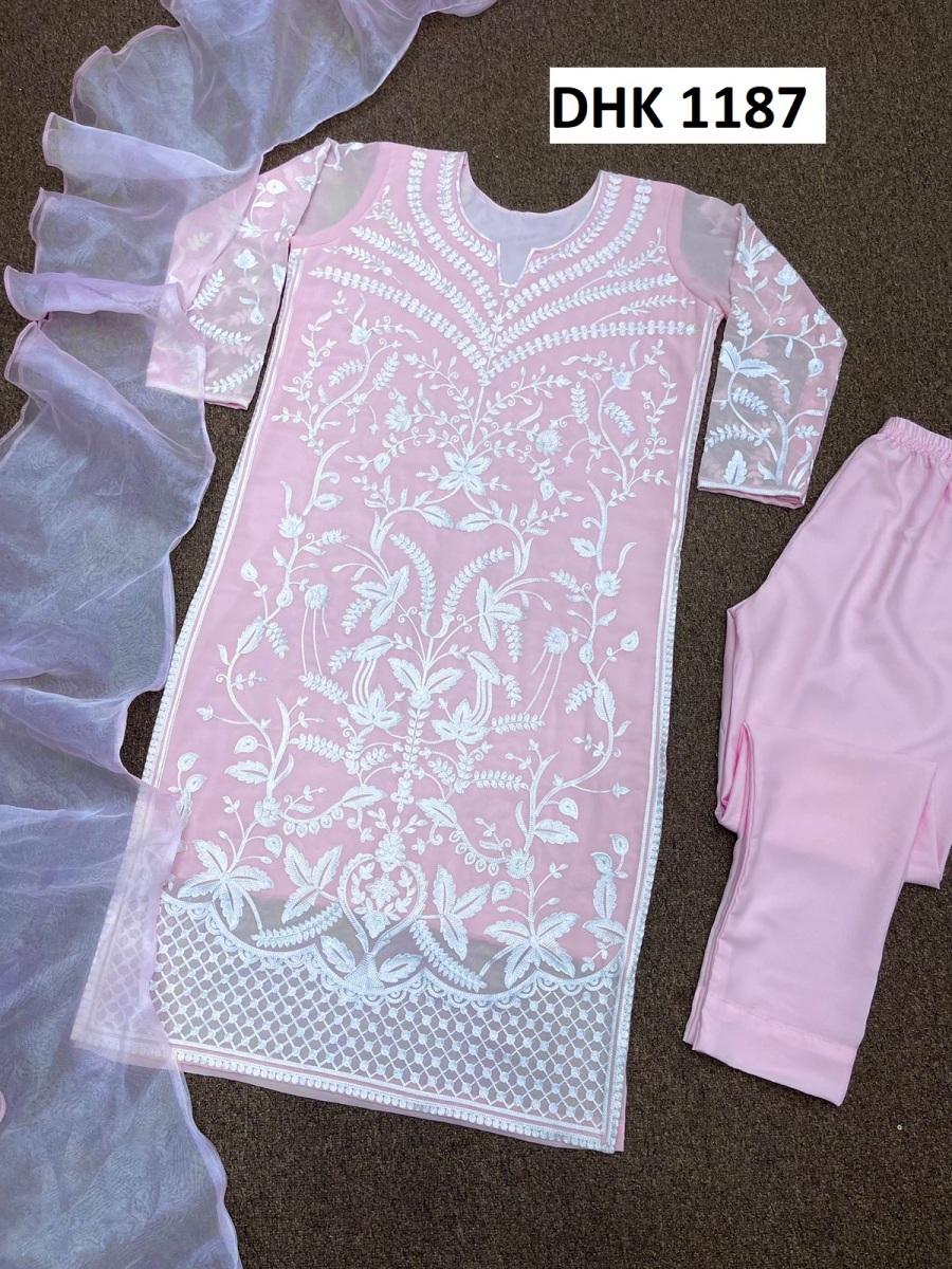 | FABRIC DETAILS | TOP FABRICE :- Heavy Fox Georgette WORK :- Heavy Embroidery Work SLEEVE :- full sleeve with heavy embroidery Work INNER :- Micro CottonPENT FABRICE :- Heavy Butter Silk WORK :- NoDUPATTA FABRICE :- Organza silk WORK :-fancy Dubble Lear Dupatta BASIC DETAILSPent Length :- 40-42 Inc Up To XXL Top Length :- 46-48 Inc Top Size :- XL FULL Stitched With XXL Margin Dupatta :- 2.1 MTR |
