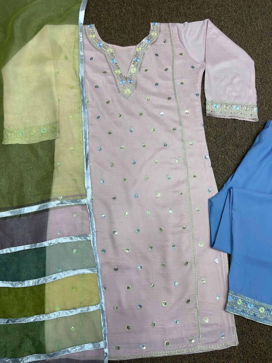 | FABRIC DETAILS | TOP FABRICE :- Heavy parampara silk WORK :- fancy Embroidery 5mm sequence work SLEEVE :-Full Sleeve With Embroidery 5mm sequence work border INNER :- Micro Cotton Bottom FABRICE :- Heavy Butter Silk with Fancy Embroidery And Sequins work lace borderDUPATTA *FABRICE:- organza silk WORK :- Multi Coloured Digital print With Fancy lace Border BASIC DETAILSBottom Length :- 40-42 Inc Up To XXL Top Length :- 42-43 Inc Top Size :- XL FULL Stitched With XXL Margin Dupatta :- 2.1 MTR |
