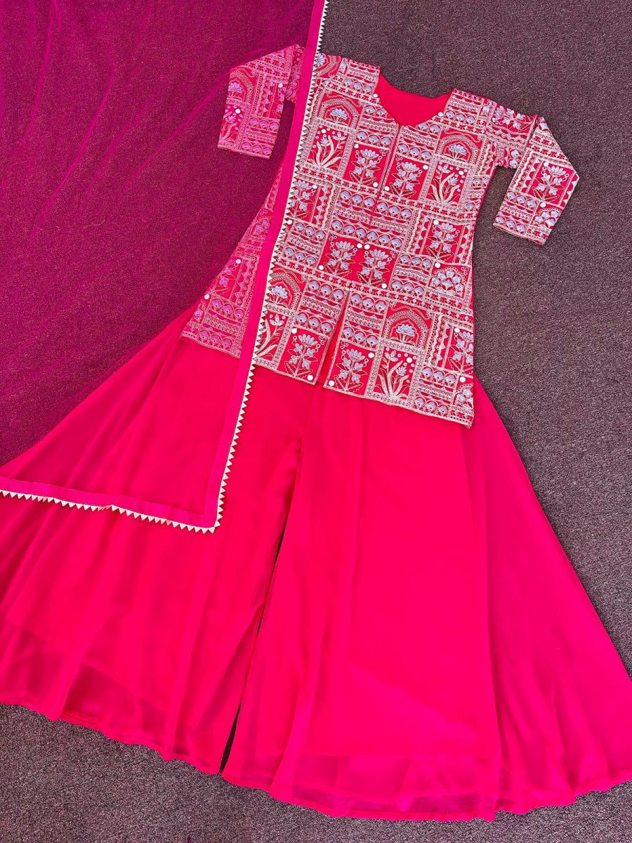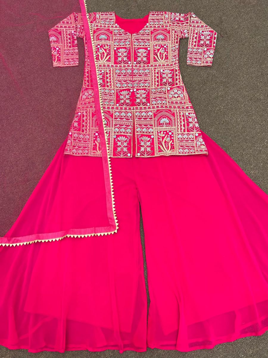 | FABRIC DETAILS | TOP FABRICE :- Heavy Fox Georgette WORK :- Fancy embroidery Coding And thread work With real mirror handwork And Stitched Zipper SLEEVE :- full sleeve with fancy embroidery Coding And thread work INNER :- Micro CottonPLAZZO FABRICE :- Heavy faux Georgette INNER:-Micro CottonDUPATTA FABRICE :- Heavy Butterfly Net WORK :- Readymade fancy lace borderBASIC DETAILSPlazzo Length :- 40-42 Inc Up To XXL TOP LANGTH:-33-34 inc Top Size :- XL FULL Stitched With XXL Margin DUPATTA :-2.1 MTR |