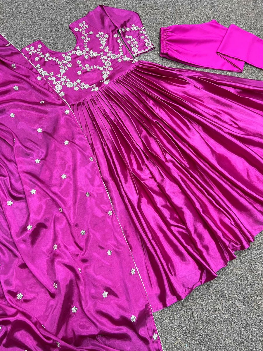 | FABRIC DETAILS | GOWN FABRICE :- Heavy sinon silk WORK :- fancy Embroidery 5mm Sequence Work SLEEVE :- Full Sleeve With Embroidery 5mm Sequence Work INNER :- Micro Cotton (ONLY FRONT SIDE WORK) BOTTOM FABRICE :- Butter SilkDUPATTA FABRICE :- Heavy sinon silk WORK :- fancy Embroidery 5mm Sequence work with fancy lace borderBASIC DETAILSGown :- Fully Stitched Gown Length :- 53-54 Inc Bottom Length :- 40-42 Inc Up To XXL Gown Flair :- 3 MTR Gown Size :- Xl stitch with XXL margin. |