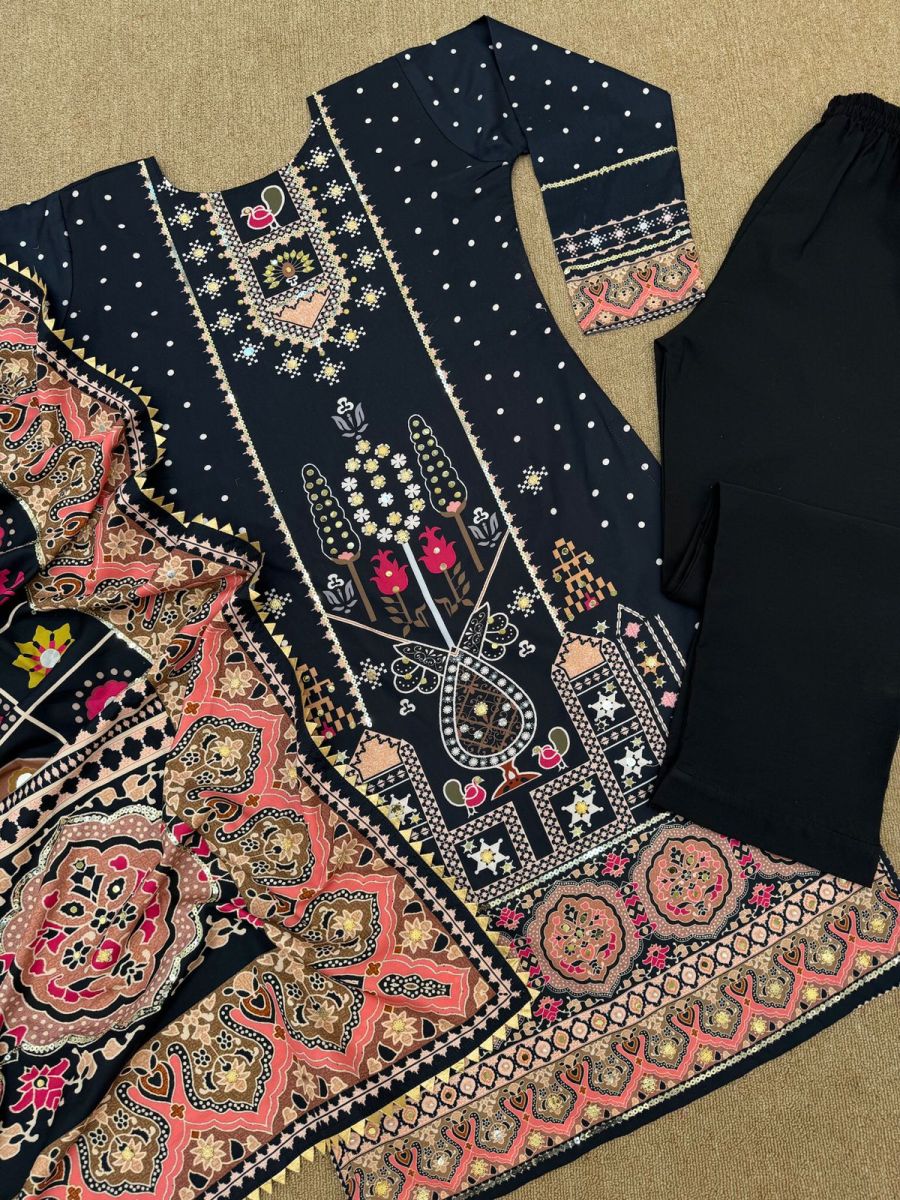 | FABRIC DETAILS | TOP FABRICE :- Heavy muslin cotton WORK :- fancy digital print with Heavy Embroidery 5mm Sequence Work and stone,merror hand work SLEEVE :- Full Sleeve With fancy digital print,Embroidery 5mm Sequence Work INNER :- Micro CottonPANT FABRICE :- Heavy butter silkDUPATTA FABRICE:- Heavy muslin cotton WORK :-fancy digital print with embroidery 5mm sequence work and stone hand workBASIC DETAILSbottom Length :- 40-42 Inc Top Length :- 42-44 Inc Top Size :- XL Stitched With XXL Margin Dupatta :- 2.1 MTR |