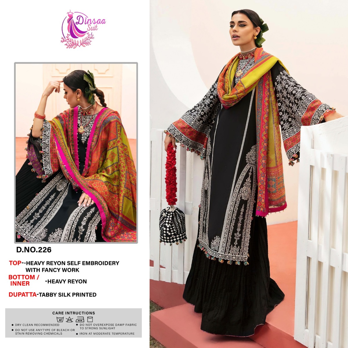 FABRIC DETAILS :- TOP :-HEAVY REYON WITH HEAVY SELF EMBRODEREY WITH MOTIBOTTOM :- HEAVY REYON PLEASE NOTE HEAVY REYON BOTTOMDUPATA:- TABBY SILK PRINTEDDINSAA SUIT 226 PAKISTANI SUITS MANUFACTURER