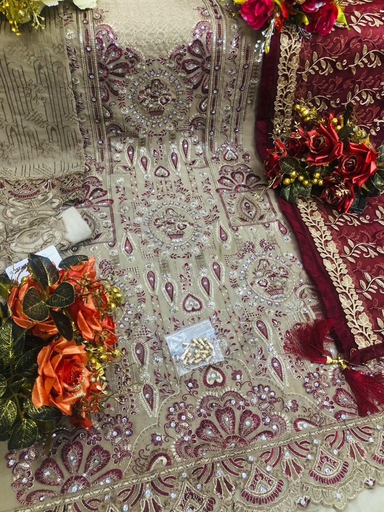 | FABRIC DETAILS | Top:- GEORGETTE EMBROIDERED Dupatta:- NET EMBROIDERED Bottom:- SANTOON INNER:- SANTOON |