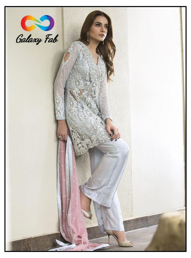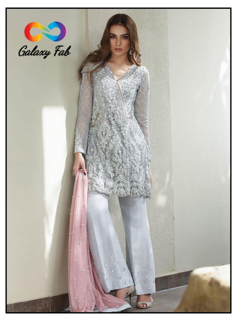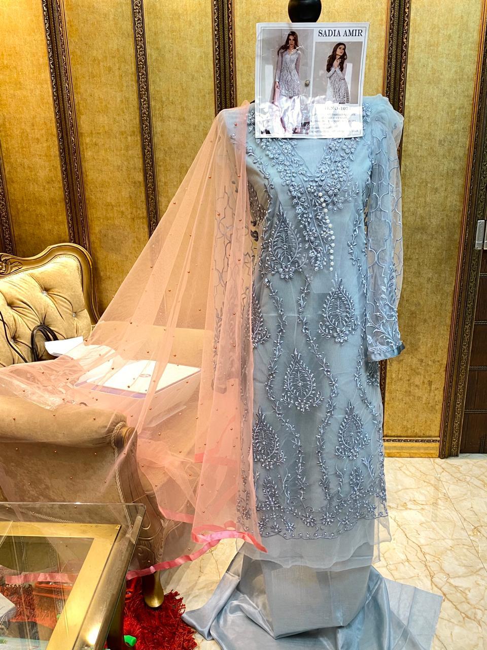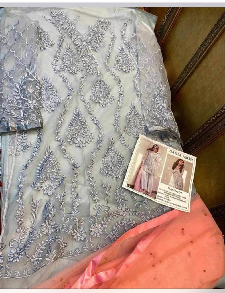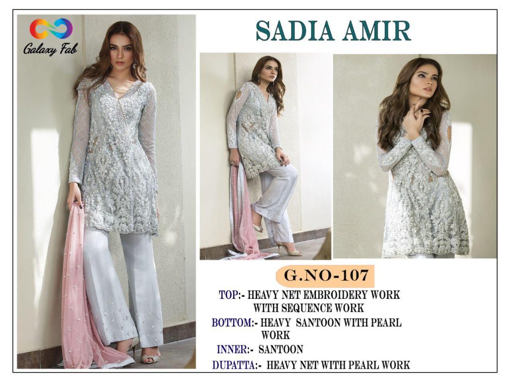 | DETAILS | GALAXY FAB PRESENT *SADIA AMIR ??Fabric details ?? ? Top :- HEAVY NET WITH SEQUENCE EMBROIDERY WORK AND HAND PEARL WORK ?Bottom/Inner :- SANTOON with pearl ?DUPATTA:- NET WITH PEARL WORK ?Price :- 1099/- + *GST*